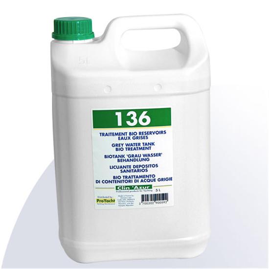136 Biotrattamento di Contenitori di Acque Grigie CLIN'AZUR è un prodotto per il trattamento biologico di serbatoi di acque grigie. Scioglie, emulsiona e degrada gli acidi grassi, permettendo l'eliminazione di grassi e cattivi odori.