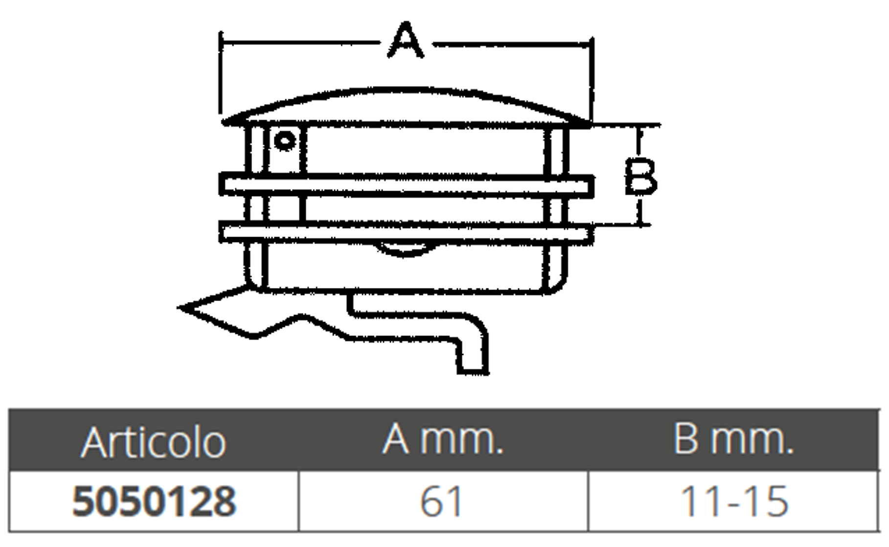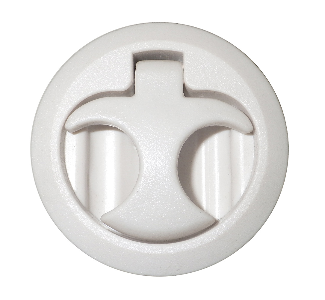 Alzapagliolo in Nylon bianco, con maniglia a molla e fermo a scatto.Completo di squadretta di battuta in acciaio inox, anelli in gomma dispessore mm 3/6/9, foro Ø mm. 50, spessore di utilizzo da mm. 11 a mm. 17
