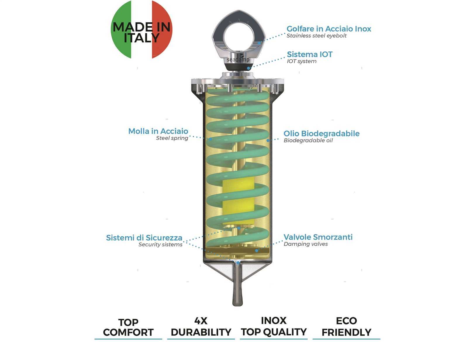Ammortizzatore da ormeggio idraulico Seares Seadamp Evo garantito a vita con molla e coperchio in Acciaio Inox ad alta resistenza e carter in Alluminio Anodizzato con ossido duro. La molla interna immersa nel fluido idraulico 100% biodegradabile garantisce una silenziosità assoluta ed uno smorzamento progressivo che riduce l'oscillazione evitando il classico cigolio. Completo di protezione anodica integrata per prevenire la corrosione. Leggerissimo, pesa solo 3 Kg. Cover opzionale in puro Silicone ideale per la protezione da eventuali urti.