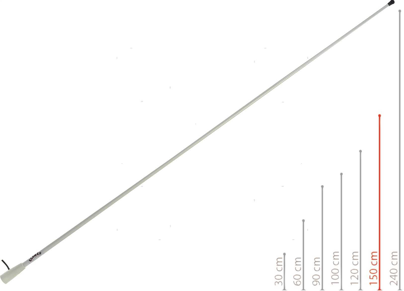Antenna in Vetroresina AM-FM RA128 per ascoltare le stazioni radio AM-FM preferite, anche al largo. 100W / AM 550-1600/FM 88-108 Mhz. Altezza 1,5 m. Completa di cavo coassiale da 6 m.