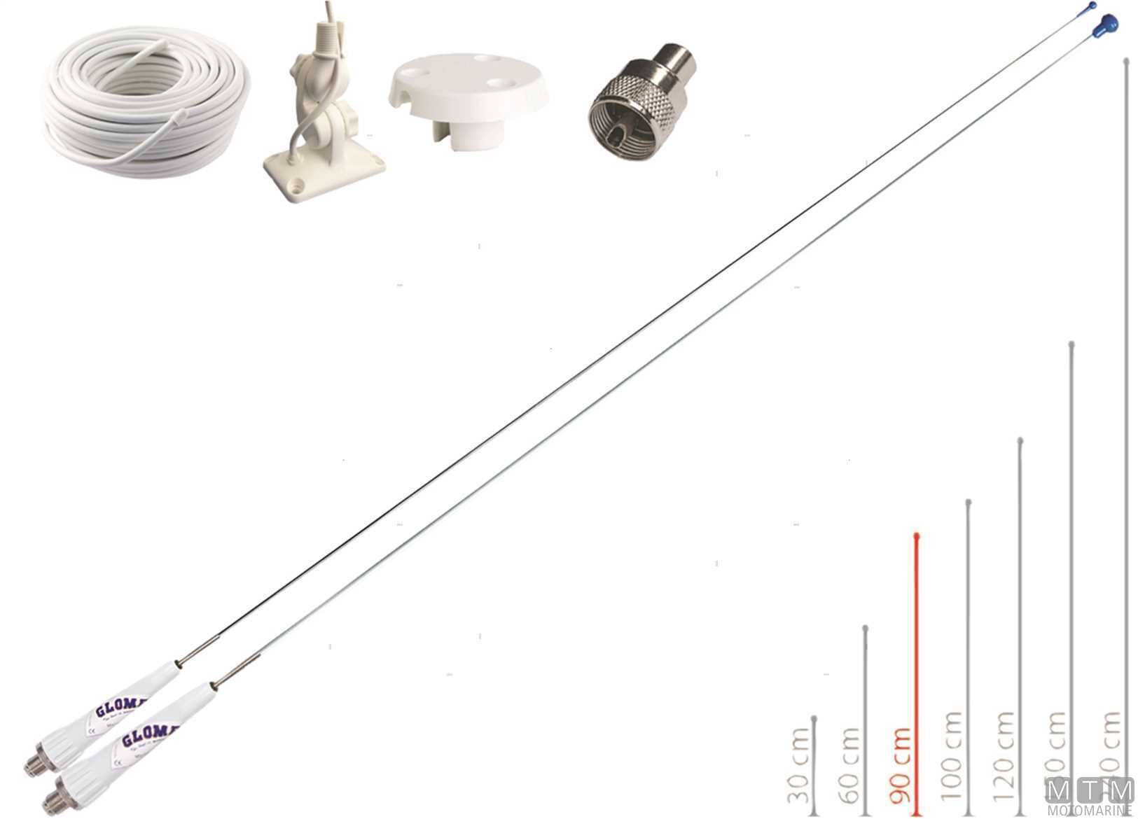 Antenne VHF RA106 in Vetroresina o in Acciaio Inox svitabili e stivabili per gommoni. 100W / 3db / 156/162 MHz / 50 Ohm. Altezza 0,9 m. Complete di connettore, cavo coassiale da 4,5 m, passacavo e base RA135.
