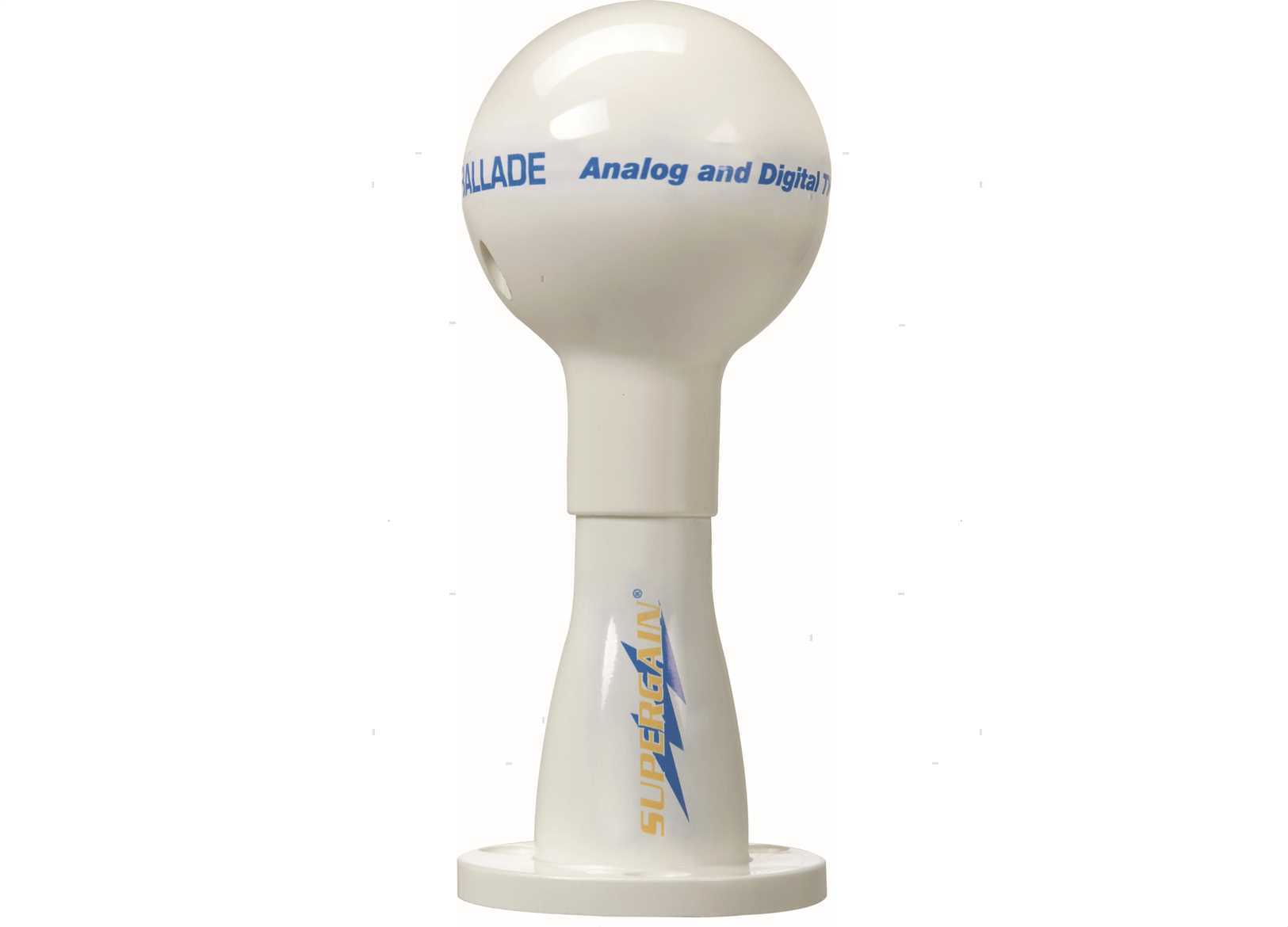 Antenna omnidirezionale Supergain Ballade per segnali TV DVBT/HDTV. Dimensioni minime e semplicità di montaggio grazie alla base integrata. Dotata di amplificatore, 5 m cavo coassiale e adattatore 12V. Frequenza: 170/890 MHz - Impedenza 75 Ohm.