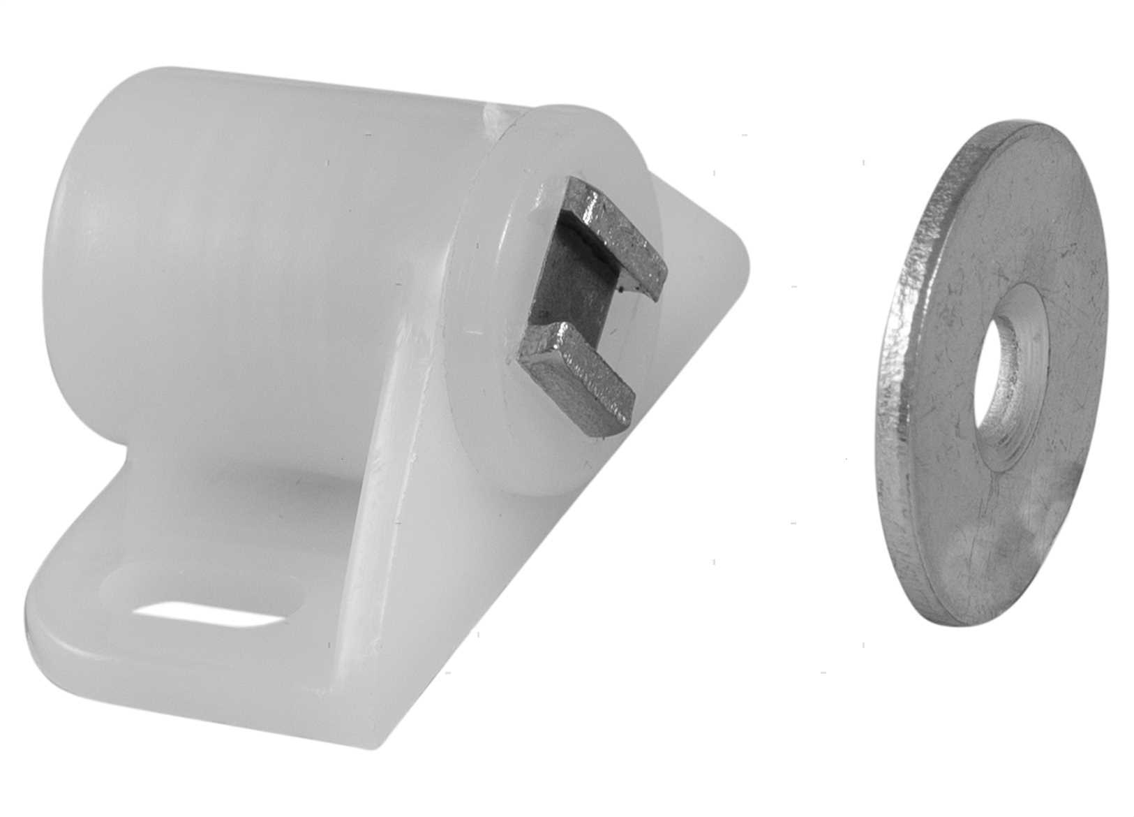 Ferma porte e portelli magnetico in plastica bianca con rondella. Composto da due parti che si montano separatamente sulla parte fissa e sulla parte mobile. Venduto in coppia.