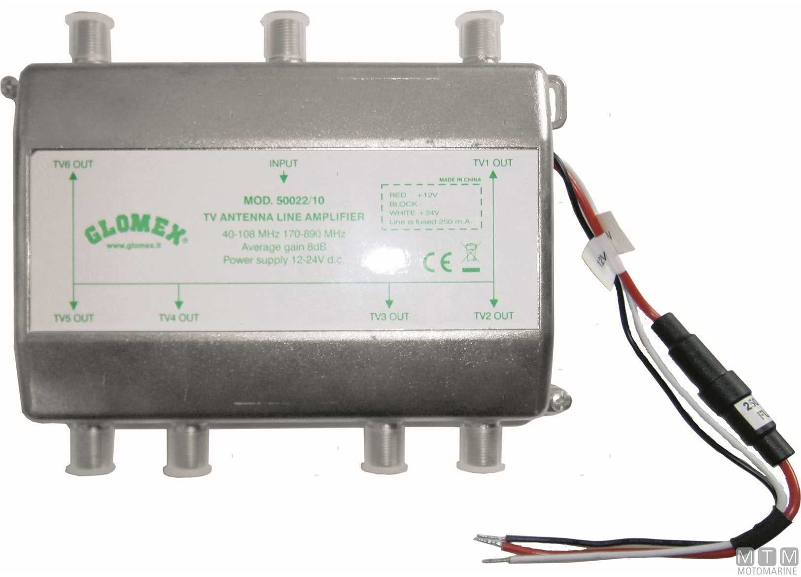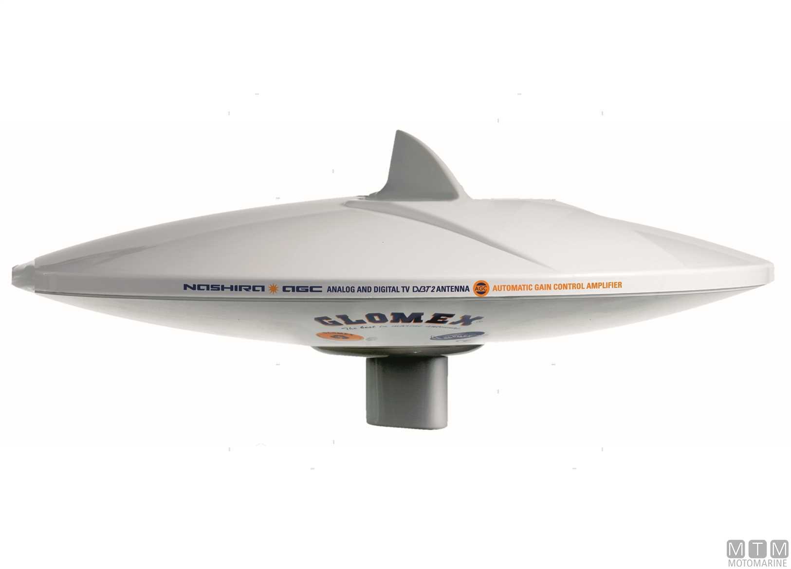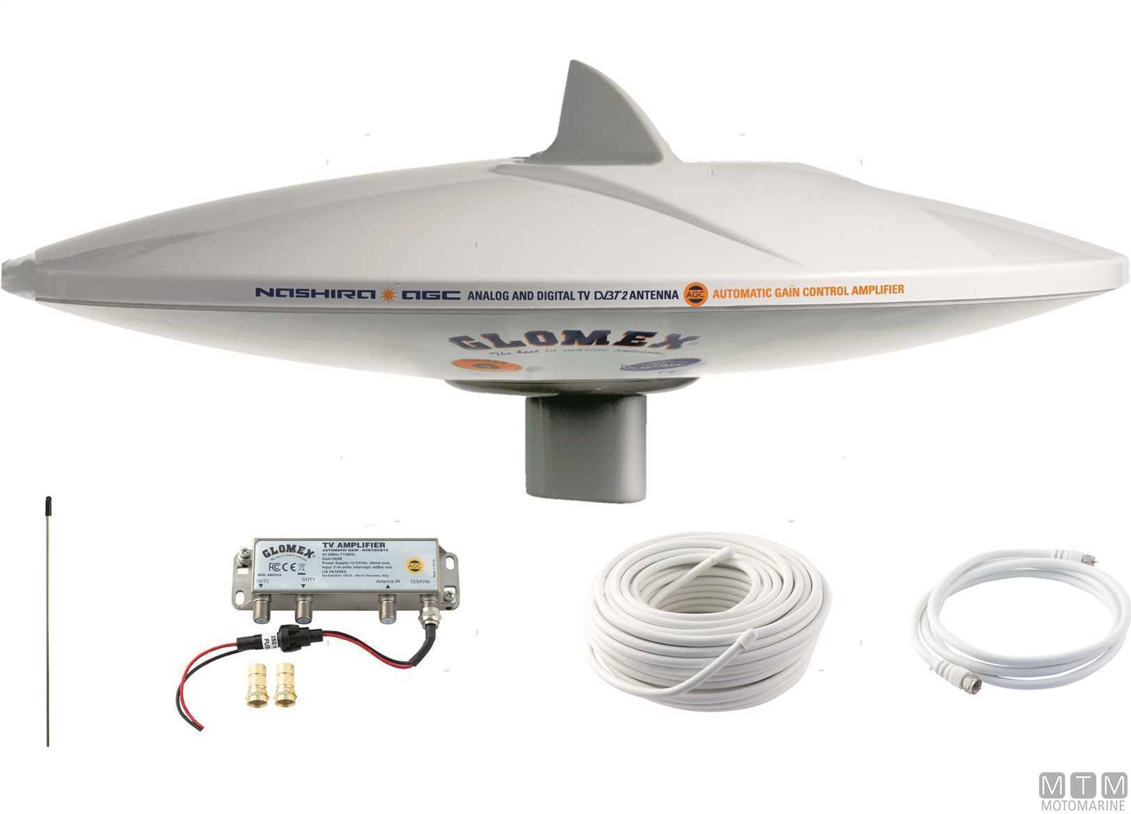 Antenna omnidirezionale Glomex V9112AGCU/DAB20 Nashira per segnali TV analogico-digitali. Grazie alla pinna da 55 mm per la ricezione verticale si catturano segnali televisivi in entrambe le polarizzazioni, orizzontale e verticale, soluzione ideale per qualsiasi tipo di imbarcazione, a vela o a motore. La base rinforzata abbinata al supporto in Acciaio Inox microfuso garantisce la massima stabilità dell’antenna in qualsiasi condizione di navigazione. Dotata di stilo per la ricezione del segnale DAB e di amplificatore con regolazione automatica del guadagno (AGC) che assicura un segnale perfetto sia al largo che in marina. Con lo splitter a due vie opzionale V9147 installato tra l’antenna e l’amplificatore, può ricevere anche le frequenze radio AM-FM. Dotata di 2 uscite TV. Frequenza 87,5/774 MHz, 174/240 MHz DAB - Impedenza 75 Ohm - Voltaggio universale 12/24V. Completa di 20 m cavo coassiale e prolunga antenna.