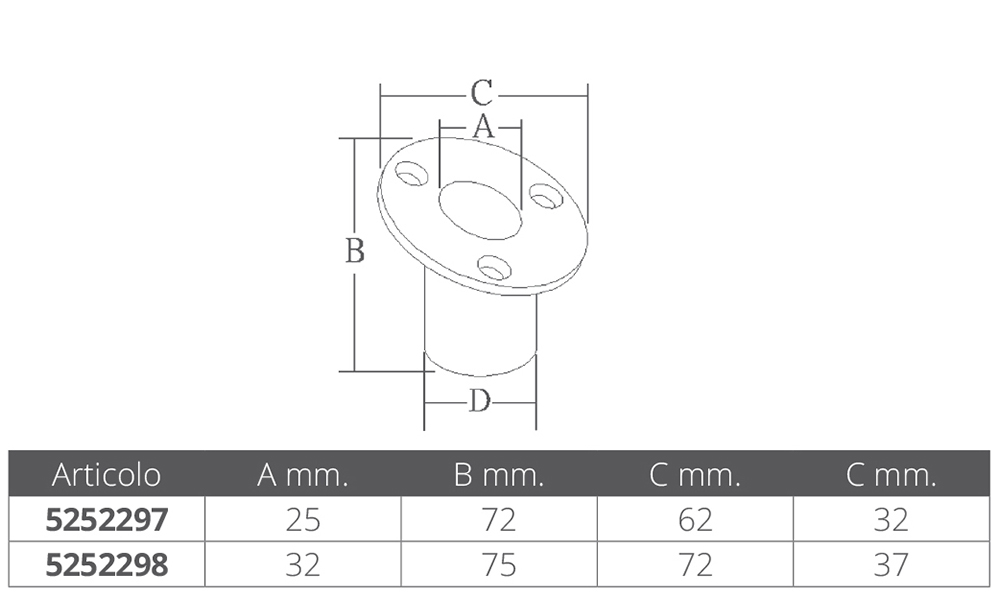 Supporto da incasso a 60° in acciaio inox AISI 316 per aste portabandiera, dim. art. 5252297 altezza mm.72 x Ø piastra mm.62 x Ø foro mm. 25 x Ø base mm. 32, art. 5252298 altezza mm.75 x Ø piastra mm.72 x Ø foro mm. 32 x Ø base mm. 37