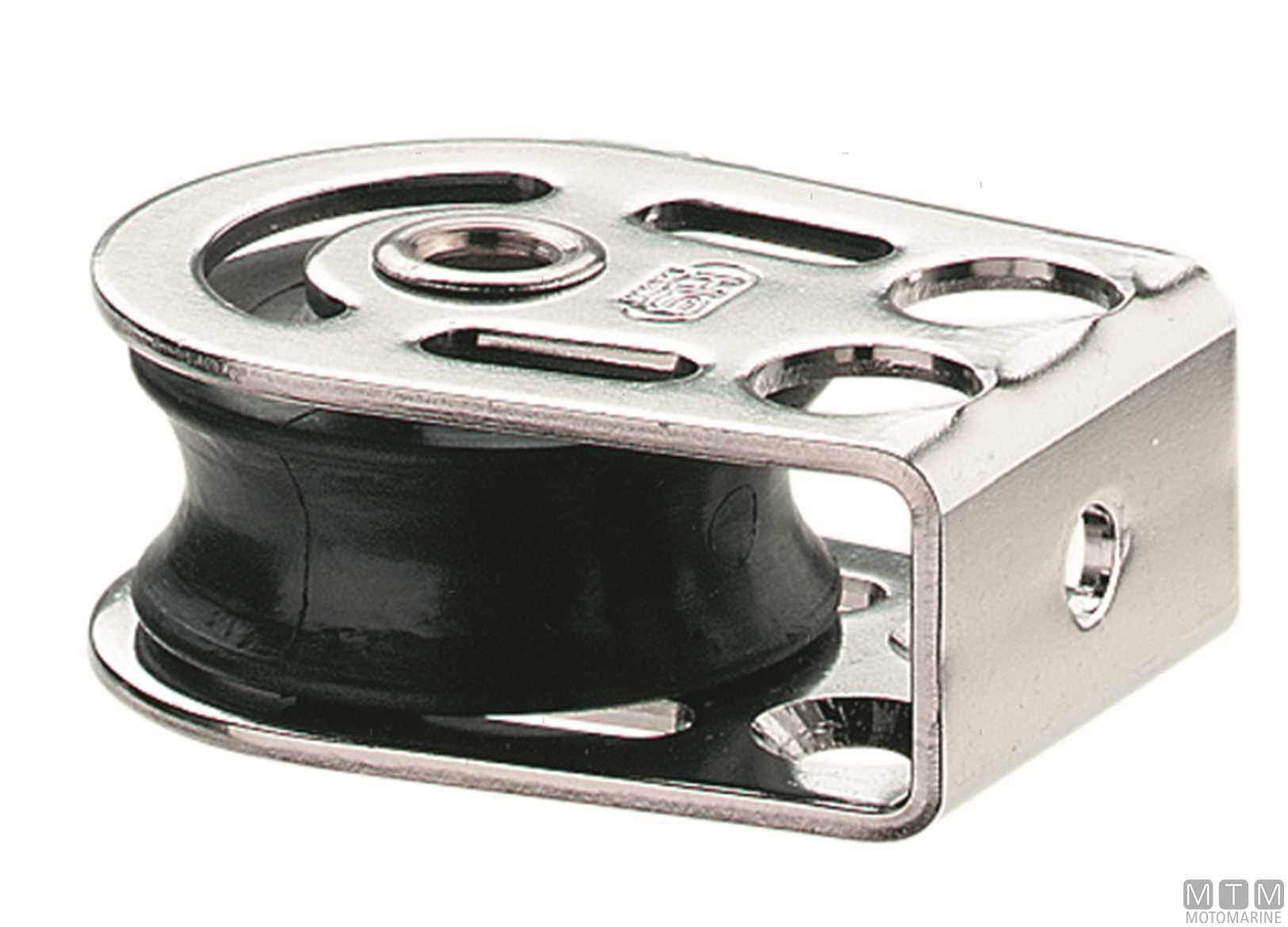 Rinvio da ponte HS con puleggia su boccola. Distanza asse puleggia - base: 25 mm. Gabbia in Acciaio Inox. Scotta <8 mm / CR = 300 Kg.