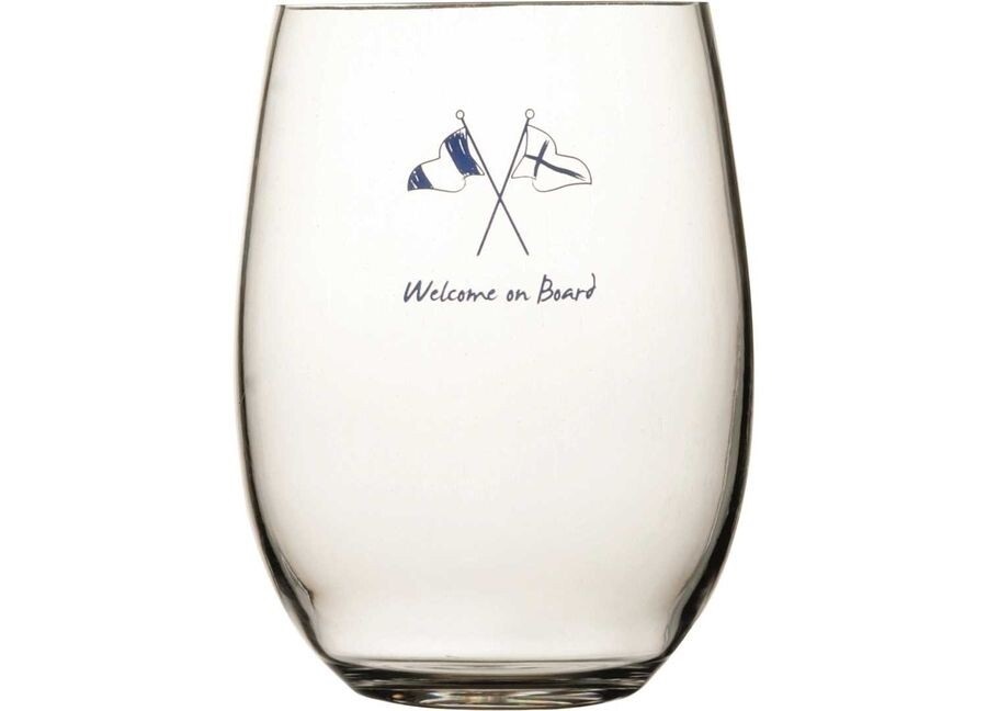 Bicchiere beverage con decoro Welcome On Board e base antiscivolo in confezione da 6 pezzi. In MS garantito 100% per uso alimentare. Lavabile in lavastoviglie, infrangibile e anti-macchia.