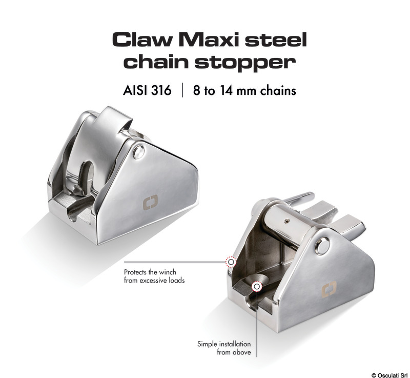 Blocca catena realizzato in acciaio inox AISI 316, ideale per aumentare la sicurezza dell’impianto di ancoraggio. In navigazione previene la discesa accidentale dell’ancora, mentre alla fonda protegge il verricello da carichi e sollecitazioni eccessive.