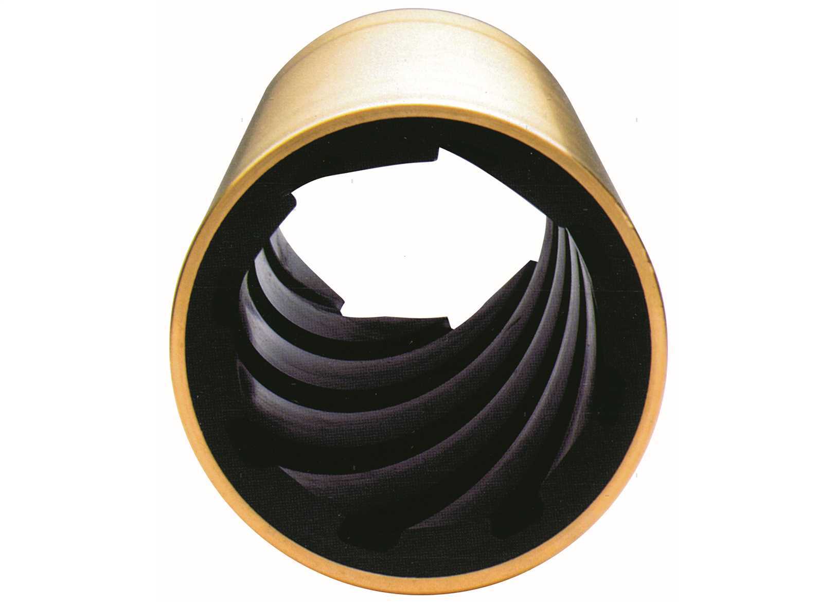 Boccole Idrolub ø interno e ø esterno in pollici Guscio in Ottone. Boccola con evoluzione destra (Dx)per elica con rotazione sinistra. Boccola con evoluzione sinistra (Sx)per elica con rotazione destra. L'asse porta-elica non ruota più in un supporto a forma poligonale, ma viene sostenuto (guidato) in tutta la sua circonferenza, riducendo le vibrazioni.La rotazione dell'asse provoca un elevato effetto pompante con un incremento notevole della velocità dell'acqua nei canali ed un migliore raffreddamento, lubrificazione e pulizia dei canali stessi.