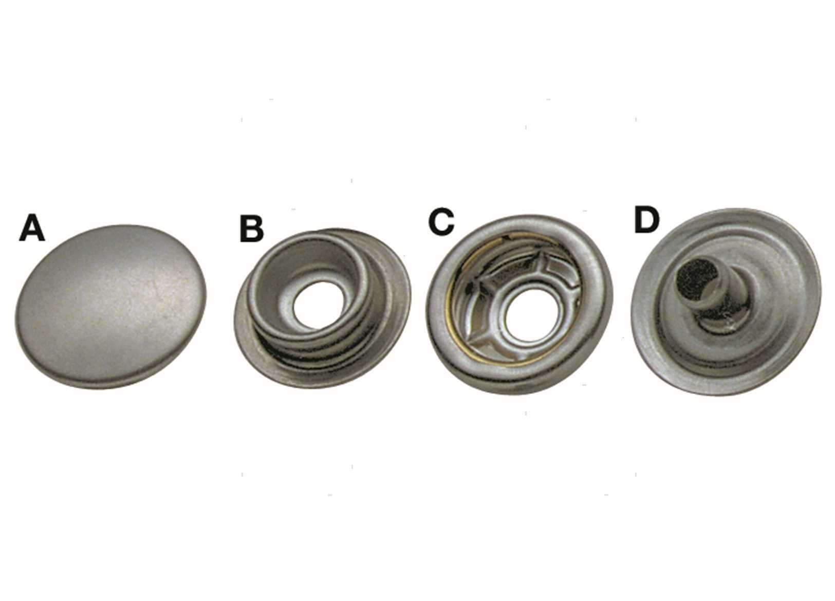Bottoni a pressare in Ottone cromato. Diametro 15 mm. Testa: si pressa sulla sotto-testa con in mezzo il tessuto. Base: si fissa su legno, VTR e metalli. Sotto-base: si pressa alla base con in mezzo il tessuto per attaccare tessuto con tessuto.