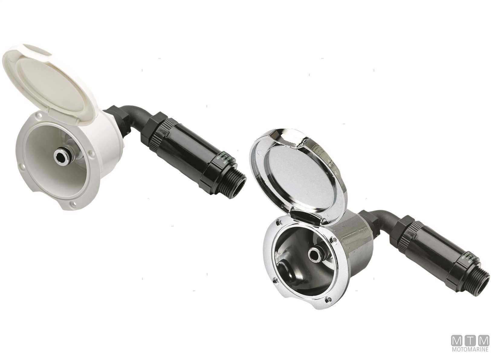 Box con attacco rapido entrata acqua ad incasso in plastica antiurto bianca oppure cromata. Innesto rapido e riduttore di pressione 3 Bar filettato 3/4" per non danneggiare le tubazioni quando si collega il circuito d'acqua di bordo alla rete della banchina.