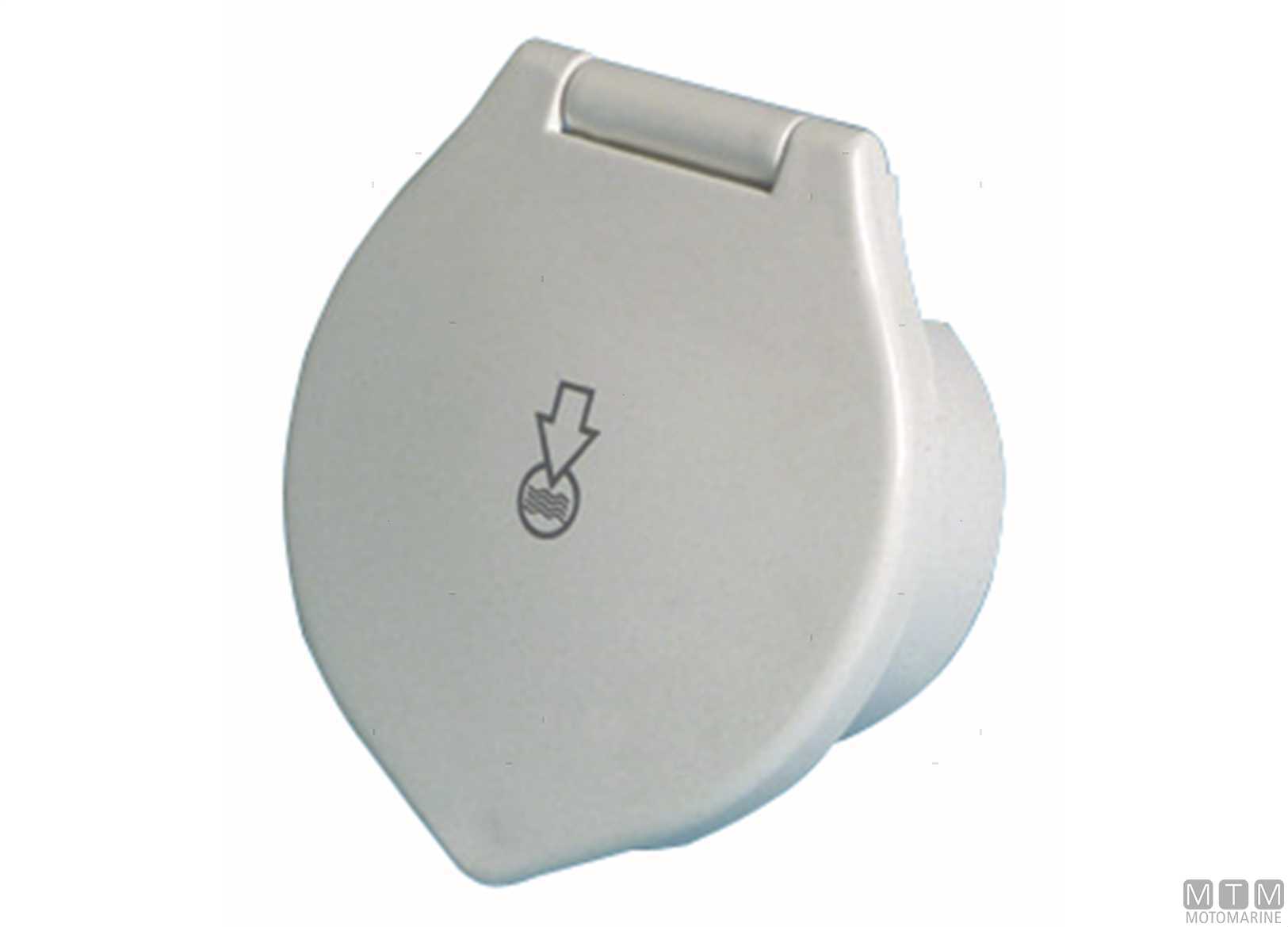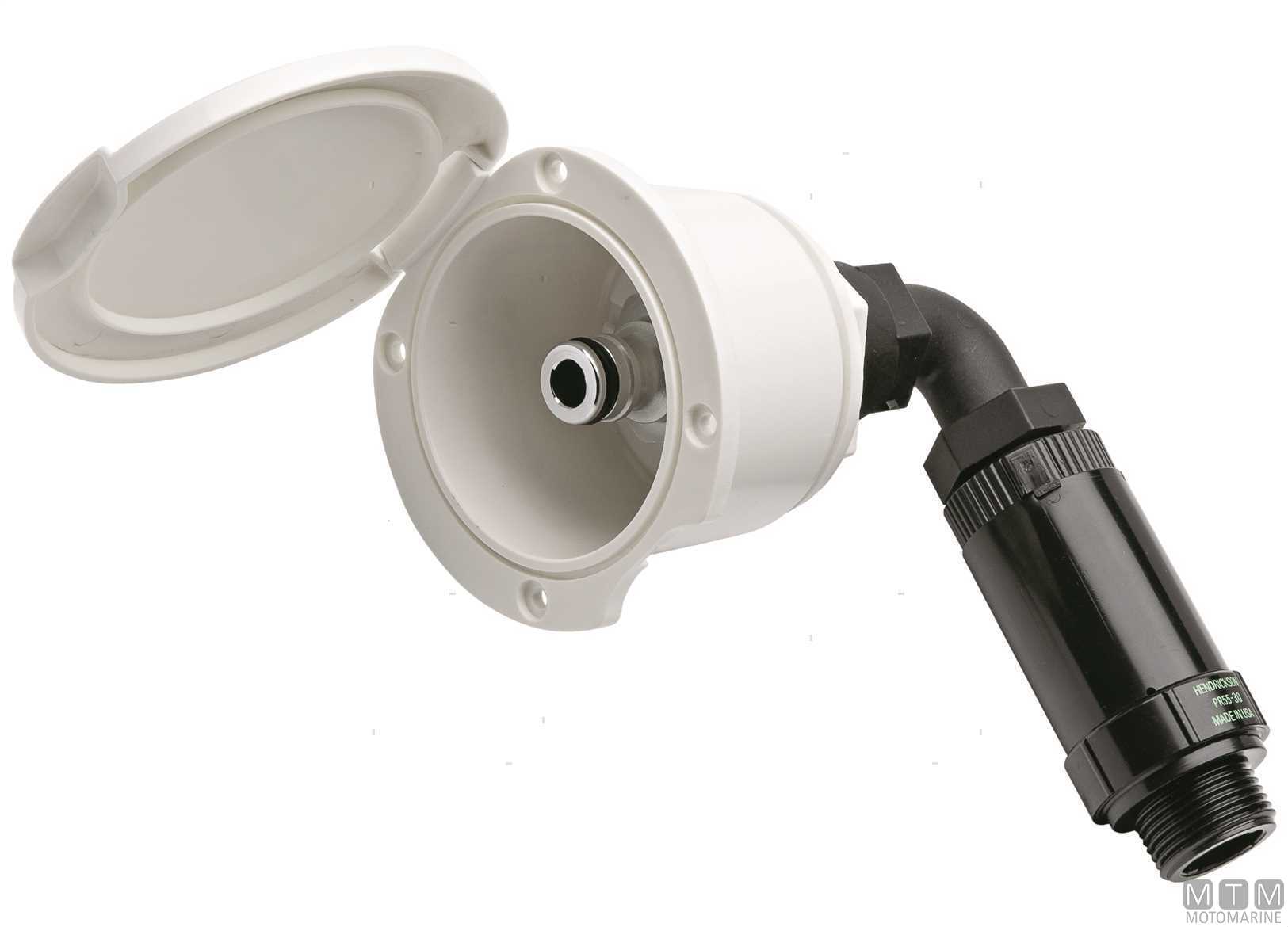 Box con attacco rapido entrata acqua ad incasso in plastica antiurto bianca oppure cromata. Innesto rapido e riduttore di pressione 3 Bar filettato 3/4" per non danneggiare le tubazioni quando si collega il circuito d'acqua di bordo alla rete della banchina.
