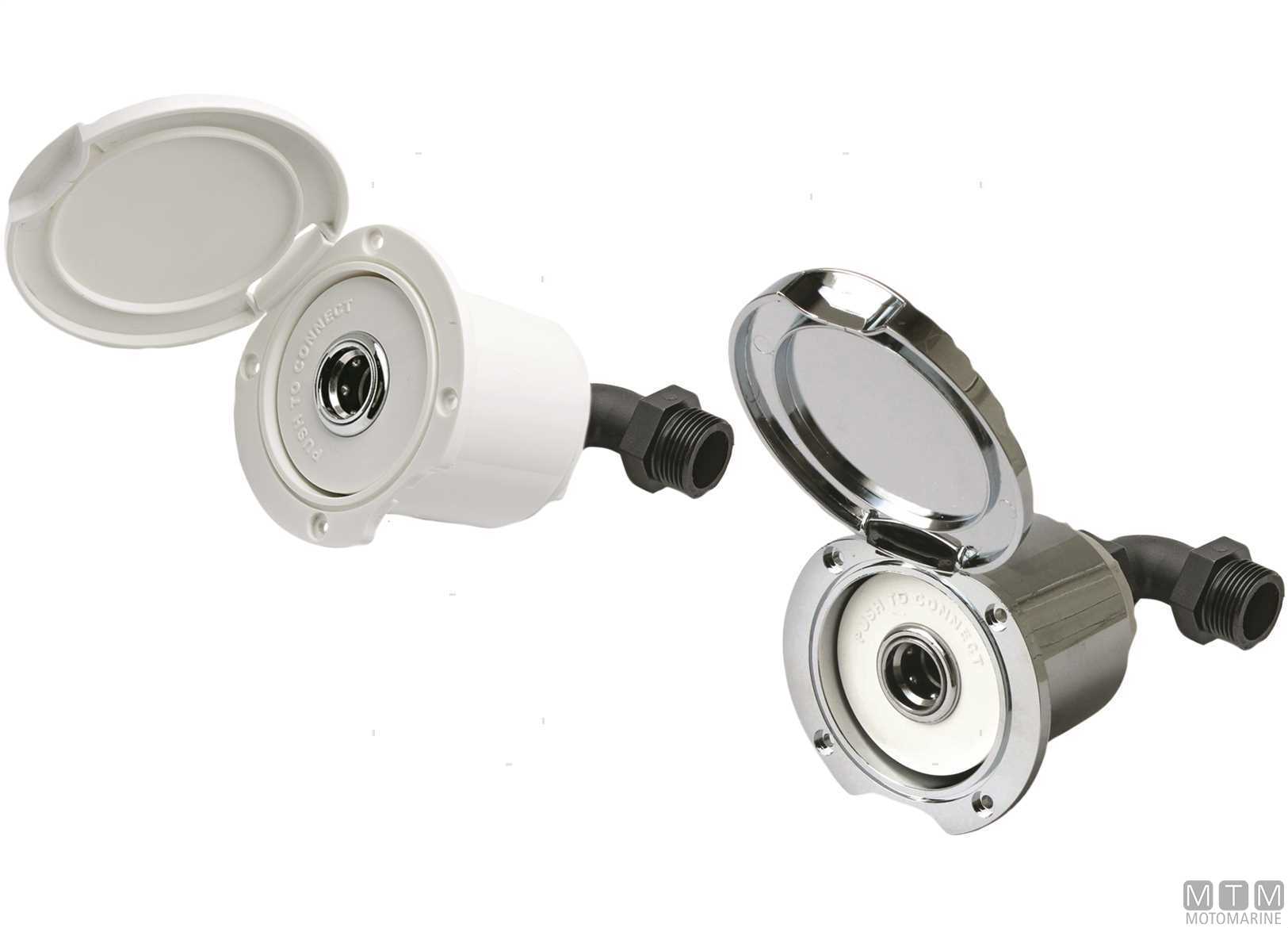 Box con attacco rapido uscita acqua ad incasso in plastica antiurto bianca oppure cromata. Innesto rapido tipo giardinaggio per lavaggio ponte e raccordo a gomito da 3/4" da collegare al circuito d'acqua di bordo.