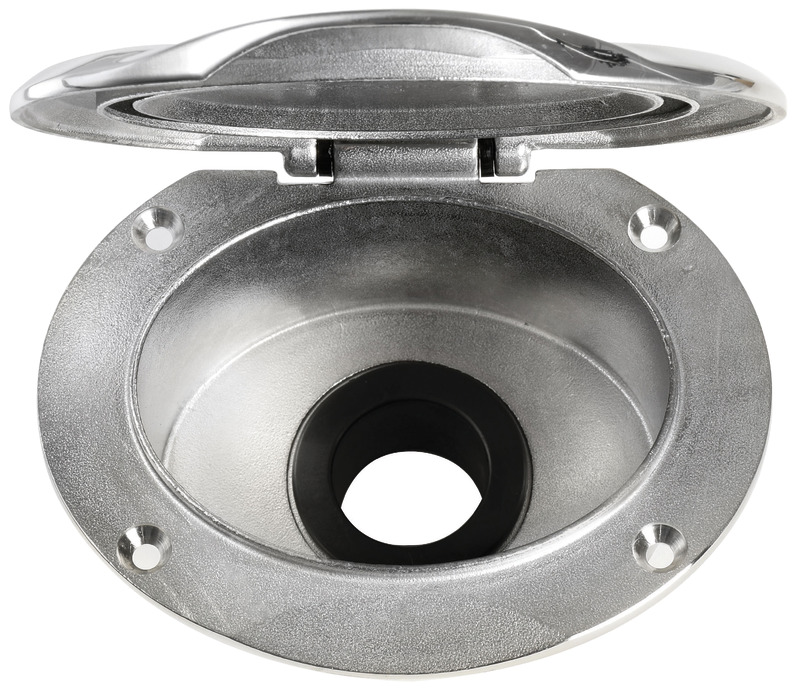 Vano doccia in acciaio inox AISI 316 con sportello autoreggente. Dotato di doccia Keji con testa maggiorata e boccola interna in gomma antivibrante.