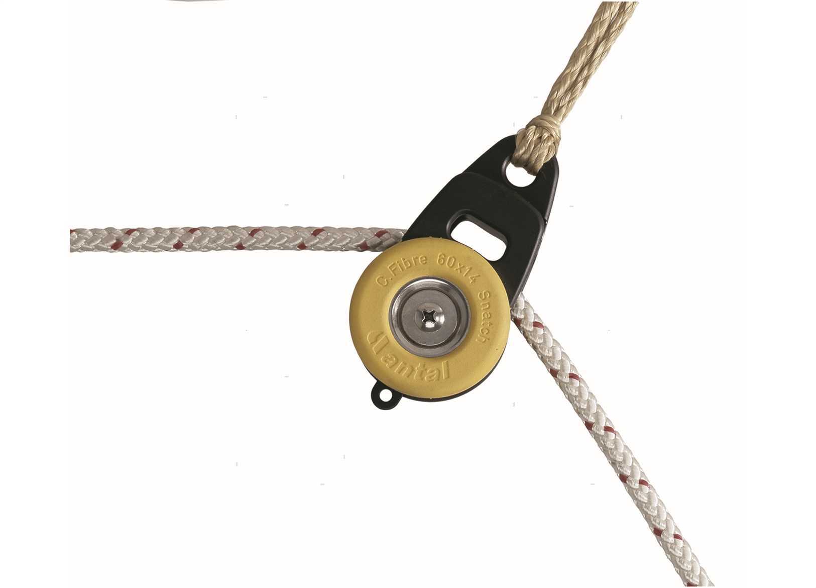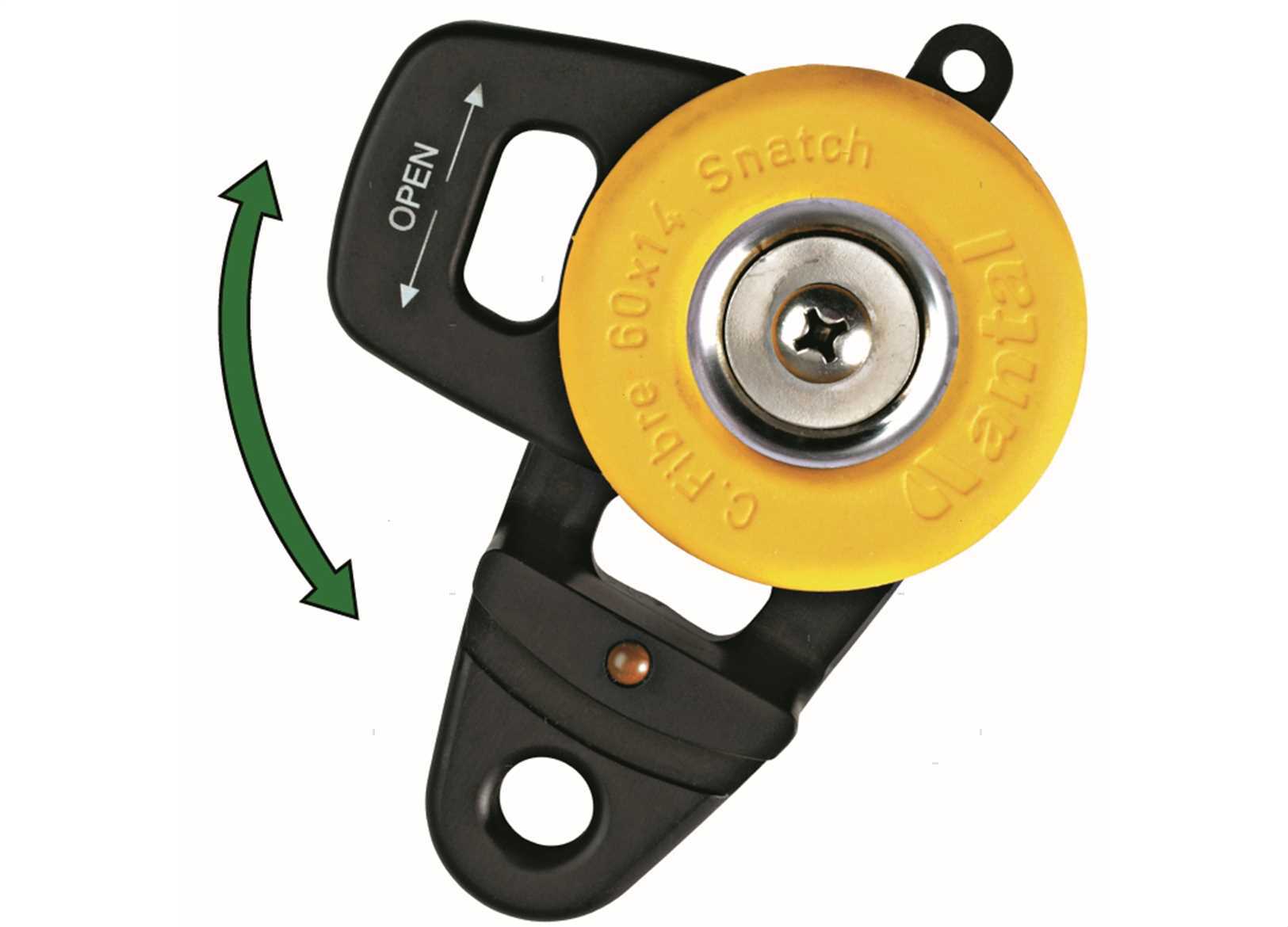 La guancia ruota attorno all’asse della puleggia permettendo l’apertura del bozzello; una sfera di sicurezza garantisce la chiusura e una vite di regolazione può bloccare il bozzello chiuso. Da connettere con una cima tessile. Fornito di arricavo per un elastico di sospensione. Materiali: puleggia con cuscinetto principale in fibra e doppio cuscinetto laterale a sfere. Guance in Alluminio ossidato nero e teflonato e protezioni laterali in gomma (gialla sulla guancia rotante).