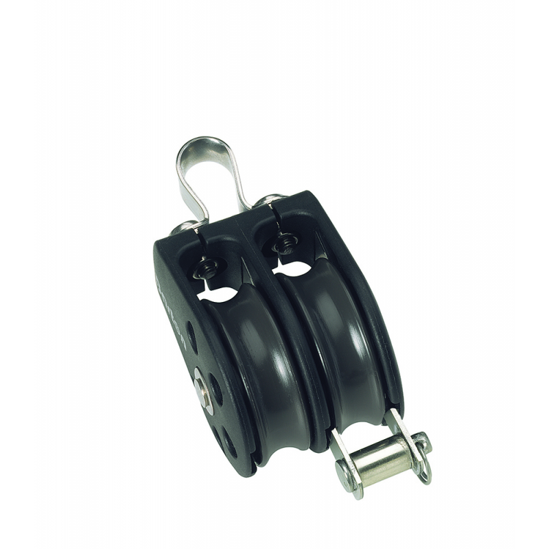 Bozzello doppio con occhio fisso, Ø cima mm. 12, max carico di lavoro kg. 630 carico di rottura kg. 1260, dimensioni puleggia mm.58 lunghezza mm.135