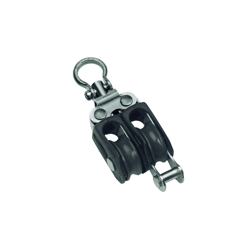 Bozzello doppio con occhio girevole e arricavo, Ø cima mm. 5, max carico di lavoro kg. 275 carico di rottura kg. 550, dimensioni puleggia mm.20 lunghezza mm.79
