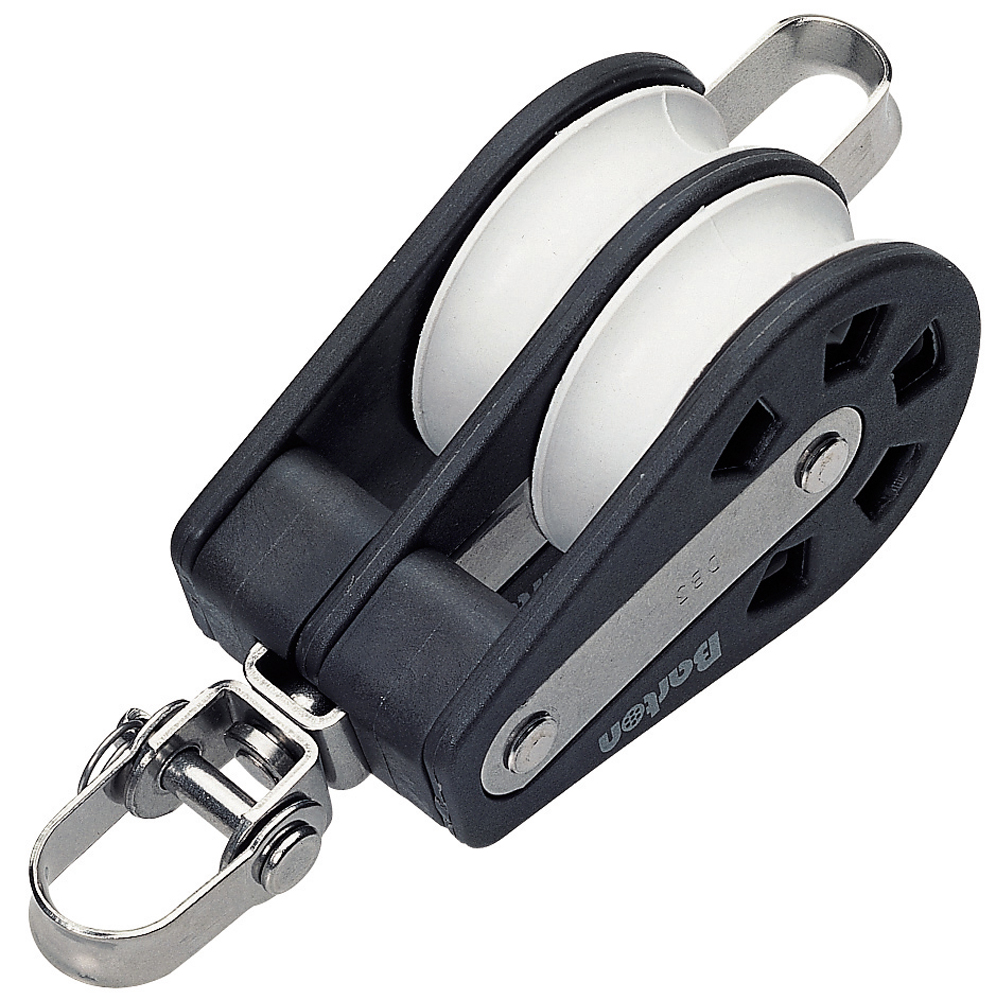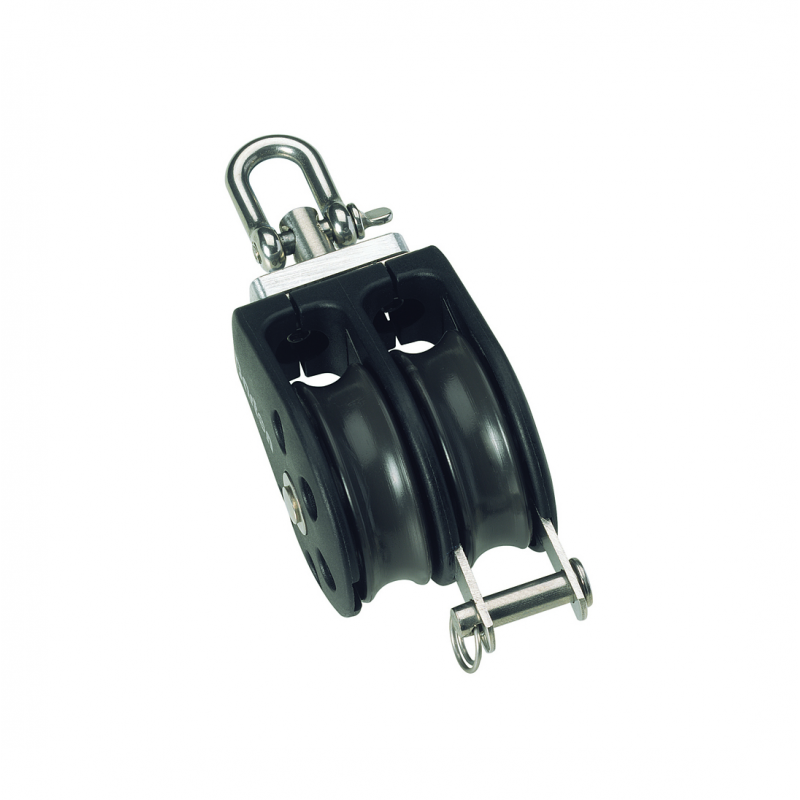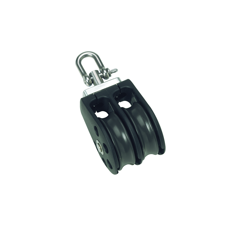Bozzello doppio con occhio girevole e arricavo, Ø cima mm. 8, max carico di lavoro kg. 350 carico di rottura kg. 700, dimensioni puleggia mm.30 lunghezza mm.100