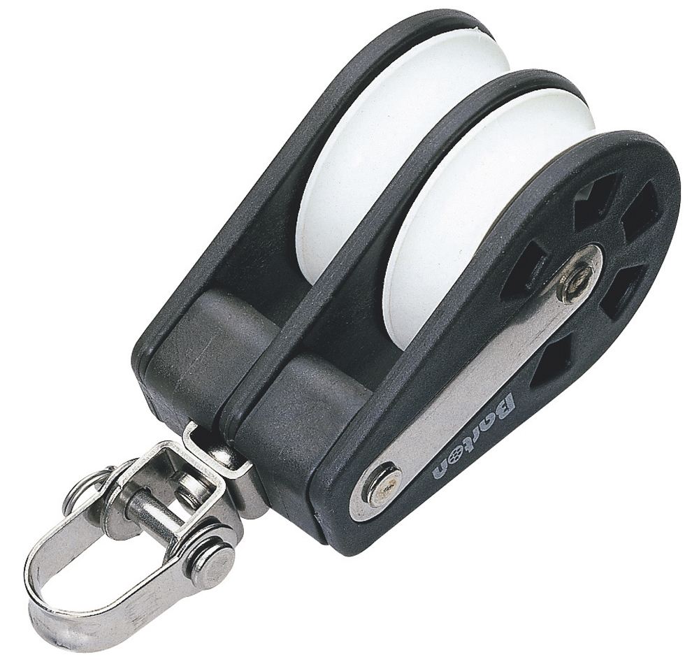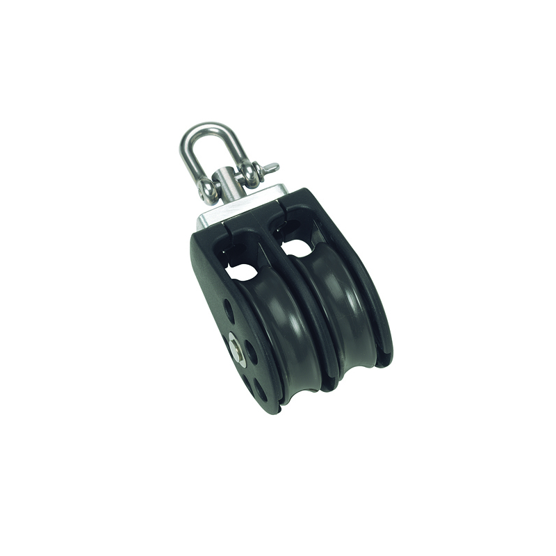 Bozzello doppio con occhio girevole, Ø cima mm. 8, max carico di lavoro kg. 350 carico di rottura kg. 700, dimensioni puleggia mm.30 lunghezza mm.90