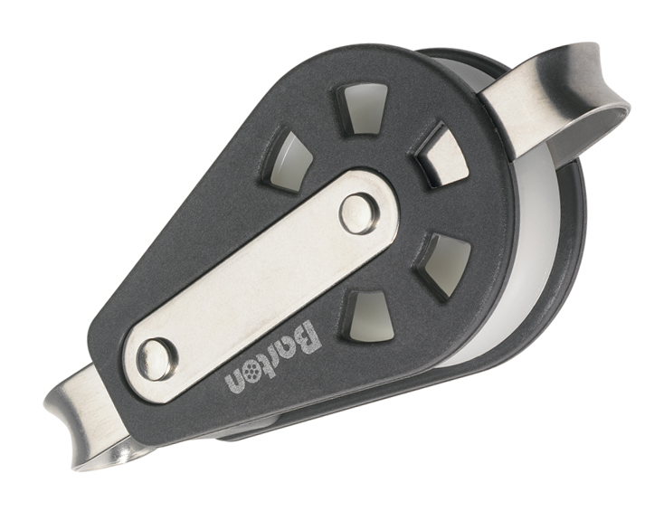 Bozzello singolo con occhio fisso e arricavo, Ø cima mm. 8, max carico di lavoro kg. 350 carico di rottura kg. 700, dimensioni puleggia mm.30 lunghezza mm.80
