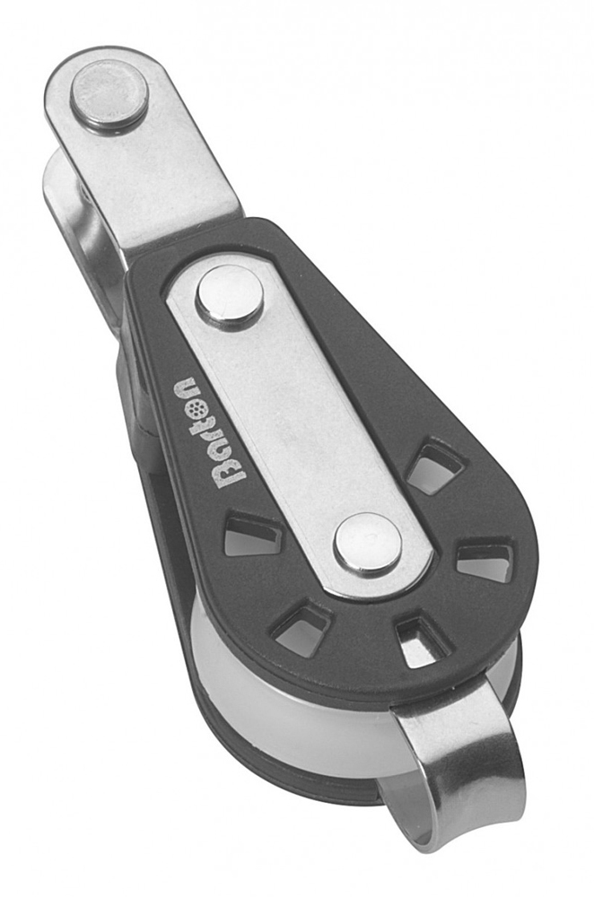 Bozzello singolo fisso con perno sfilabile e arricavo, Ø cima mm. 8, max carico di lavoro kg. 370 carico di rottura kg. 740, dimensioni puleggia mm.35 lunghezza mm.97