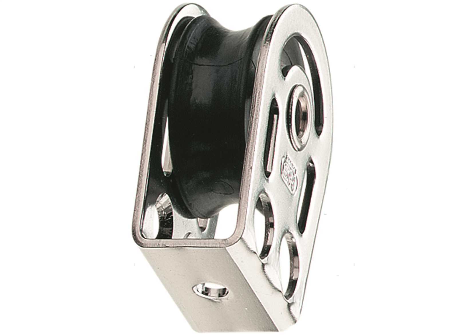 Rinvio da ponte HS con puleggia su boccola. Distanza asse puleggia - base: 25 mm. Gabbia in Acciaio Inox. Scotta <8 mm / CR = 300 Kg.