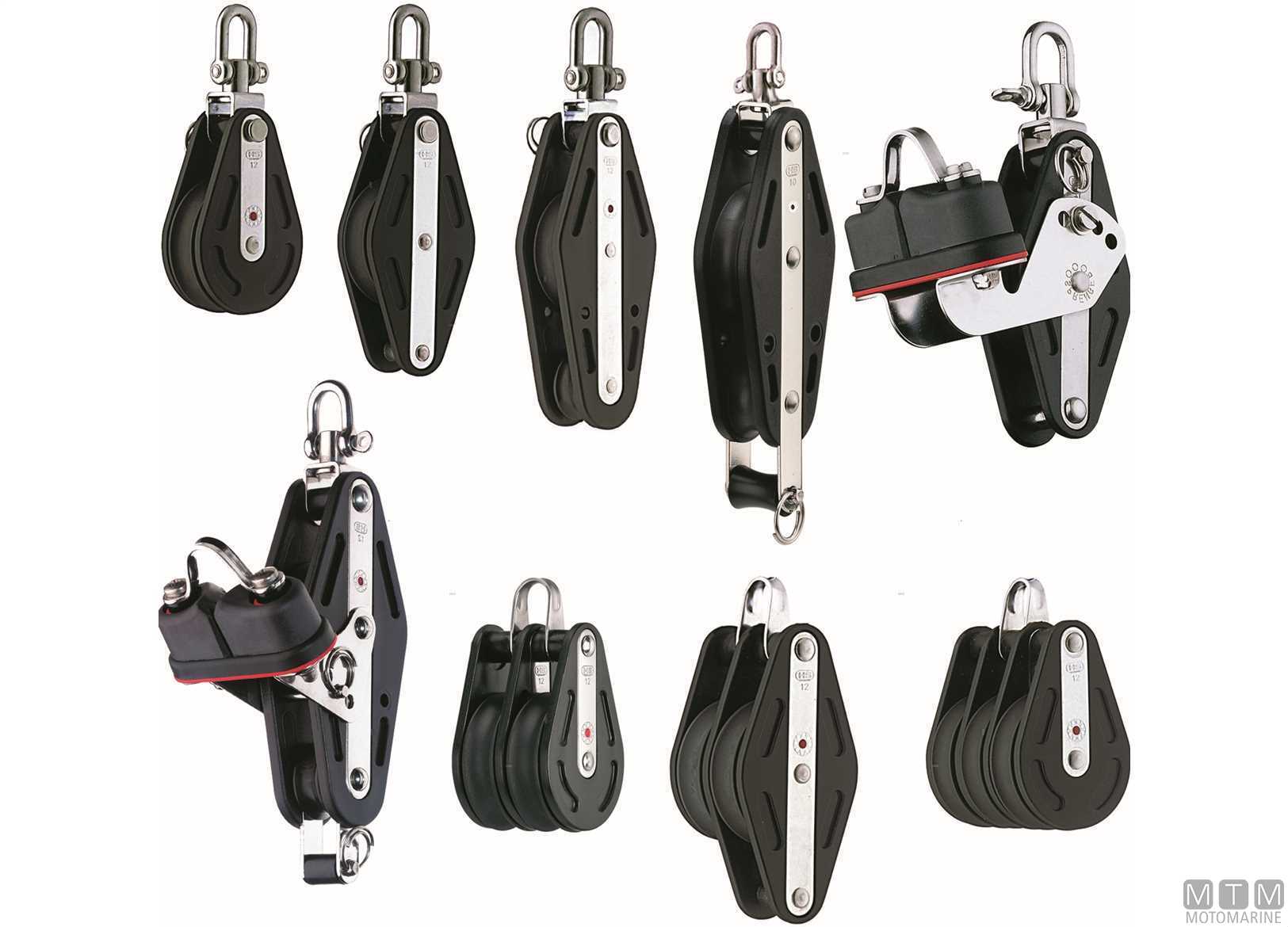 Bozzelli HS su sfere per scotte fino a 12 mm. ↵Sfere e rinforzi in Acciaio Inox. ↵Diametro puleggia 50 mm.↵Carico di rottura 1000 Kg.