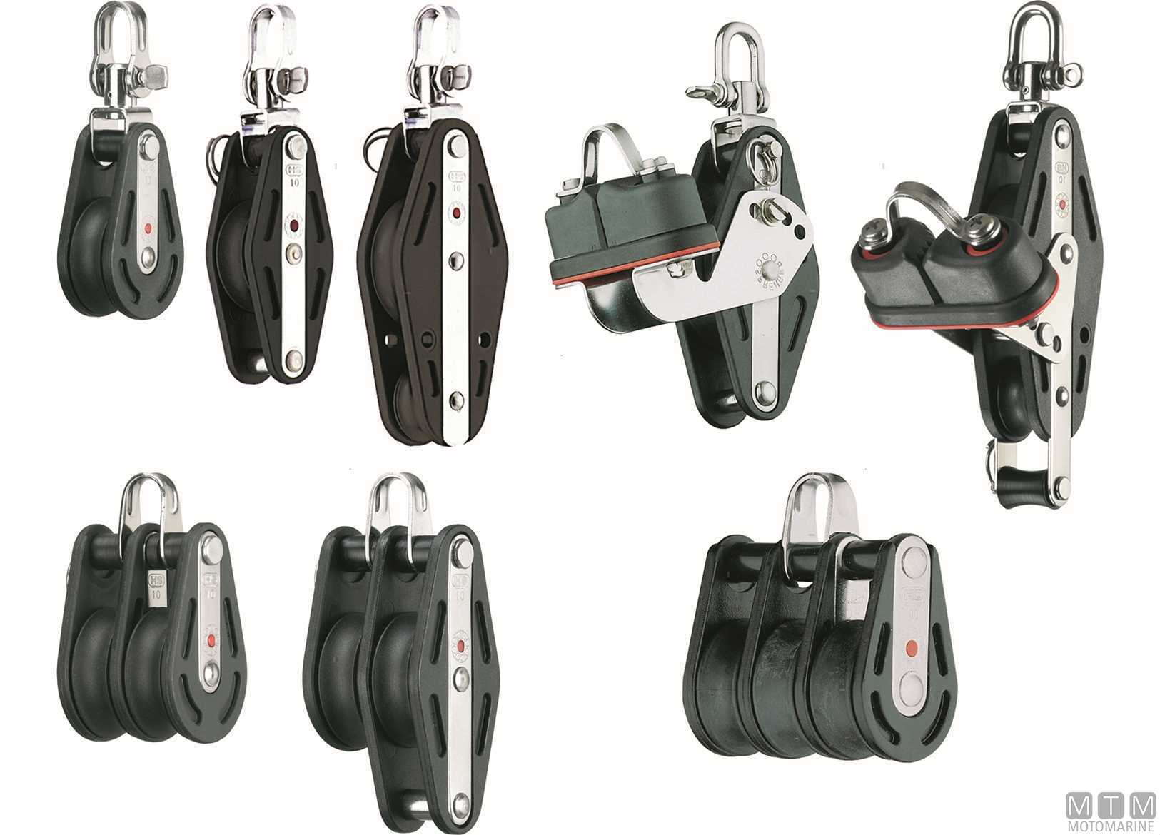 Bozzelli HS su sfere per scotte fino a 10 mm. ↵Sfere e rinforzi in Acciaio Inox.↵Diametro puleggia 36 mm.↵Carico di rottura 850 Kg.