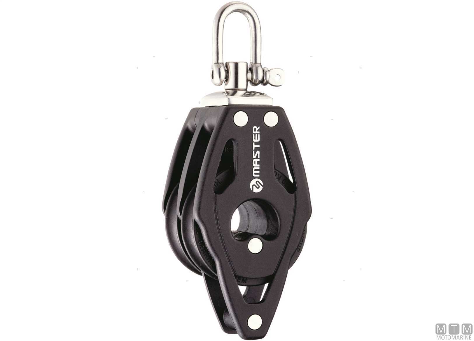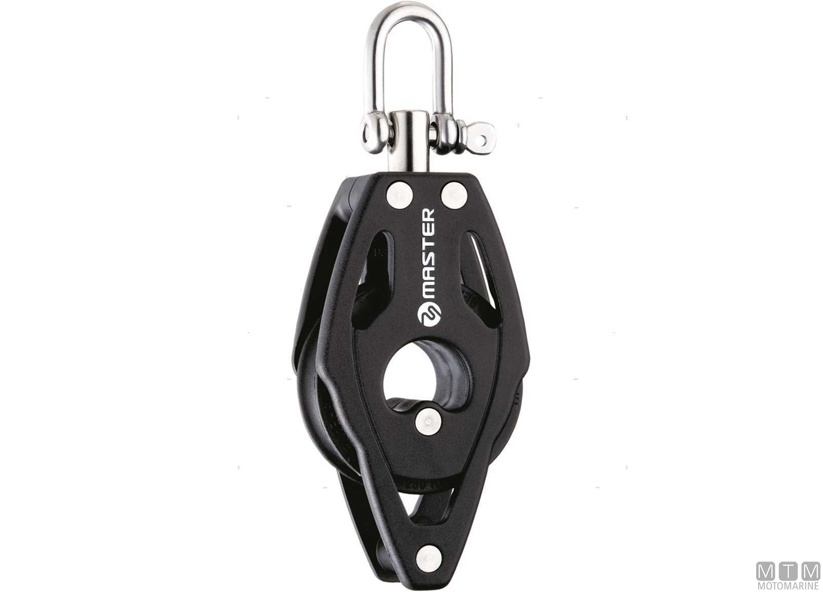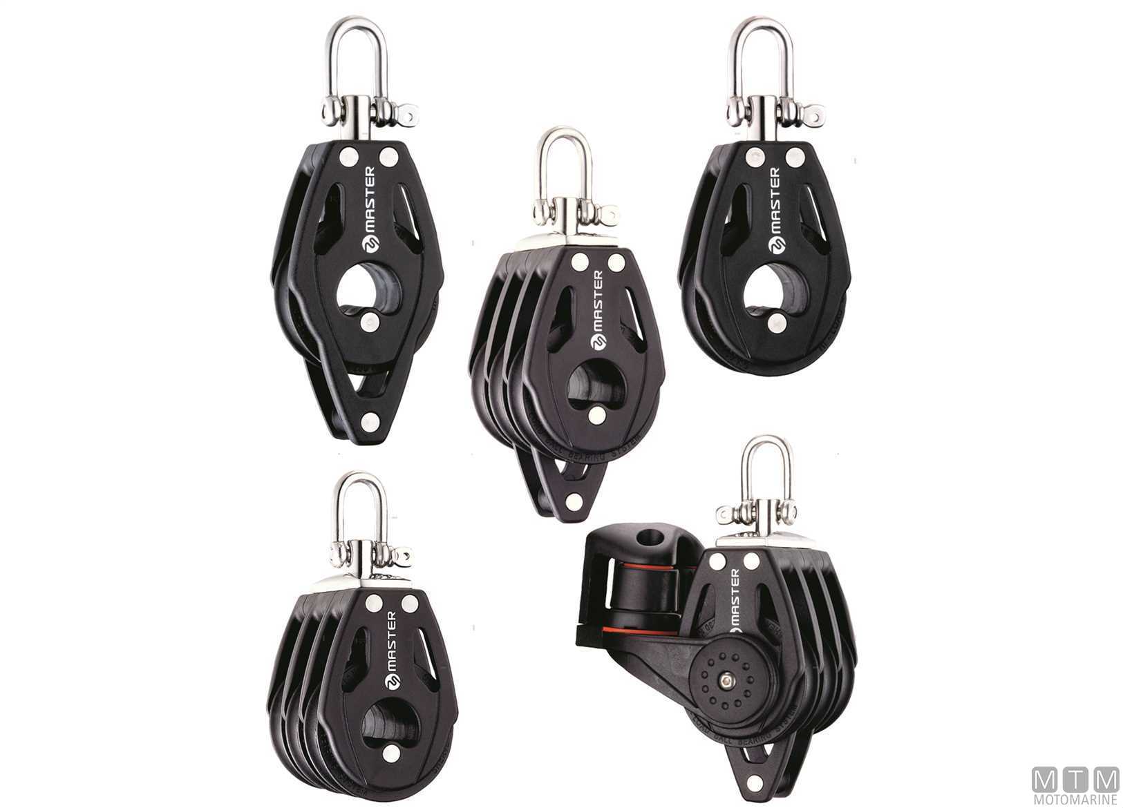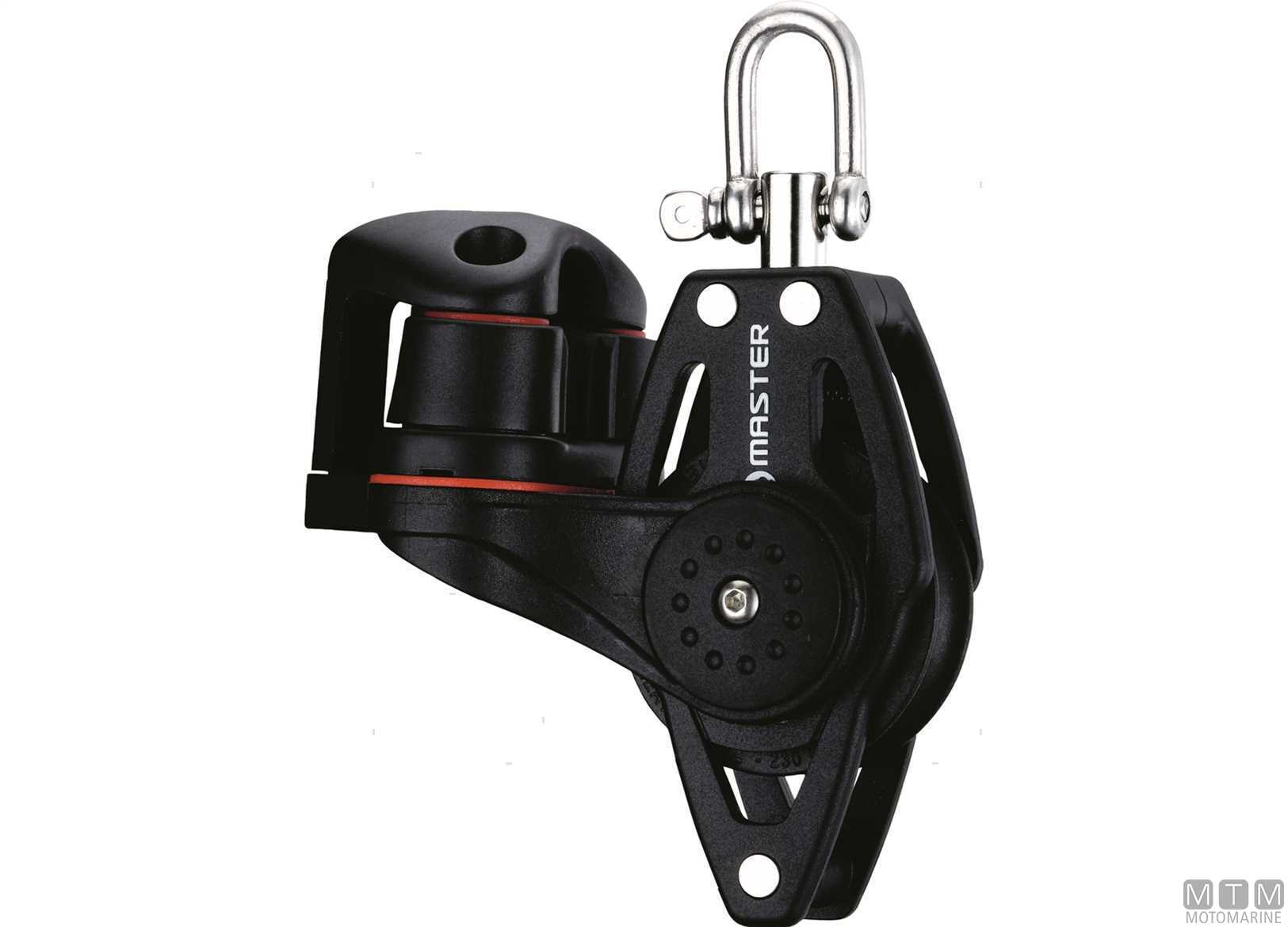 Bozzelli Master su sfere con puleggia da 75 mm. Cassa in materiale composito ultra leggero rinforzato con fibra e UV resistente. Il grillo girevole può essere bloccato in due posizioni grazie alla leva di blocco. Sfere ad alto scorrimento in Delrin stabilizzato UV. ↵NB. Il carico di lavoro/rottura dei bozzelli con strozza scotte sono relativi allo strozza scotte.