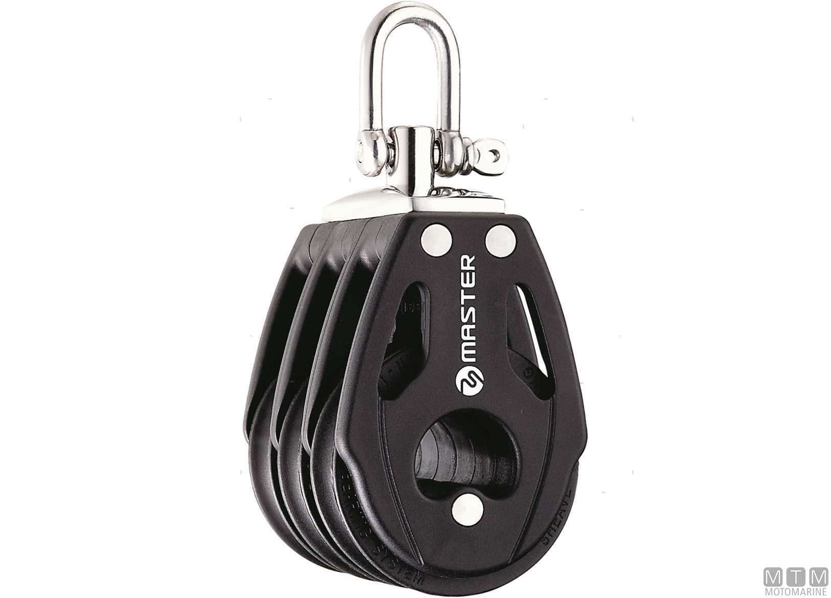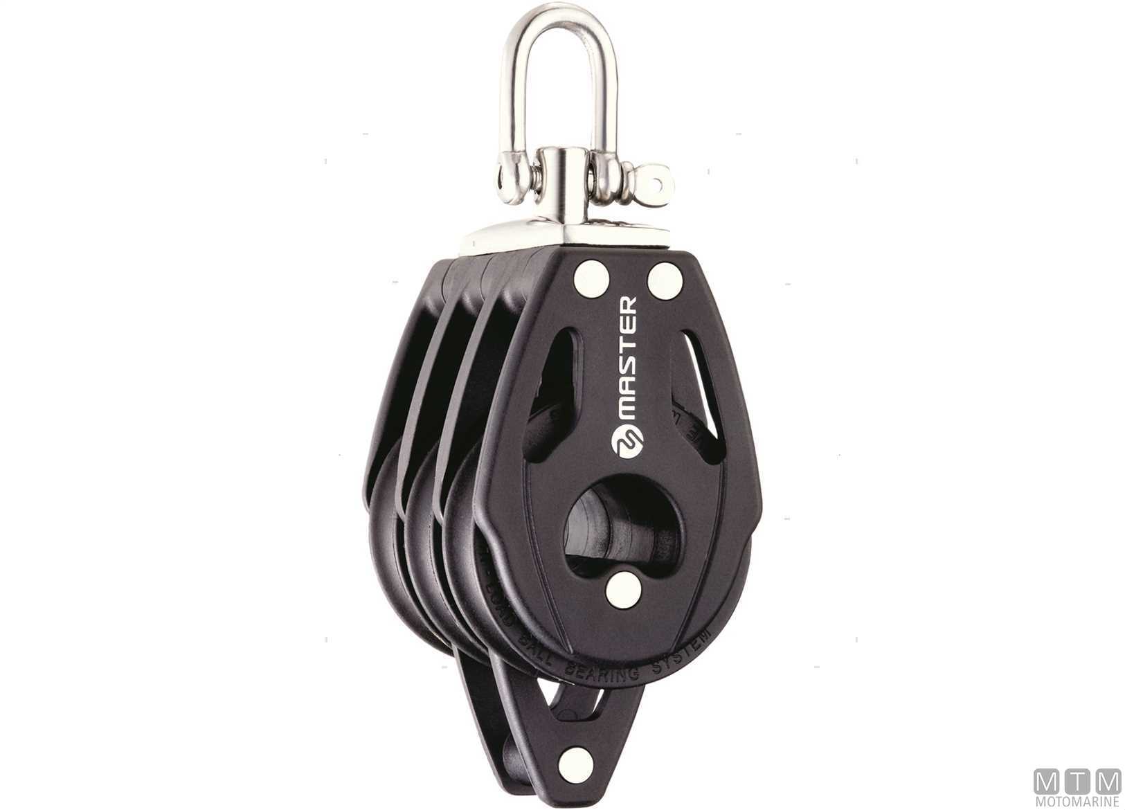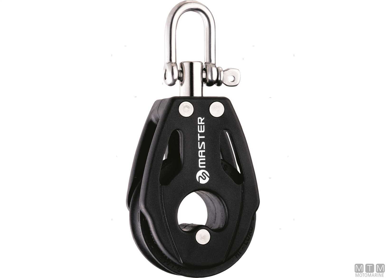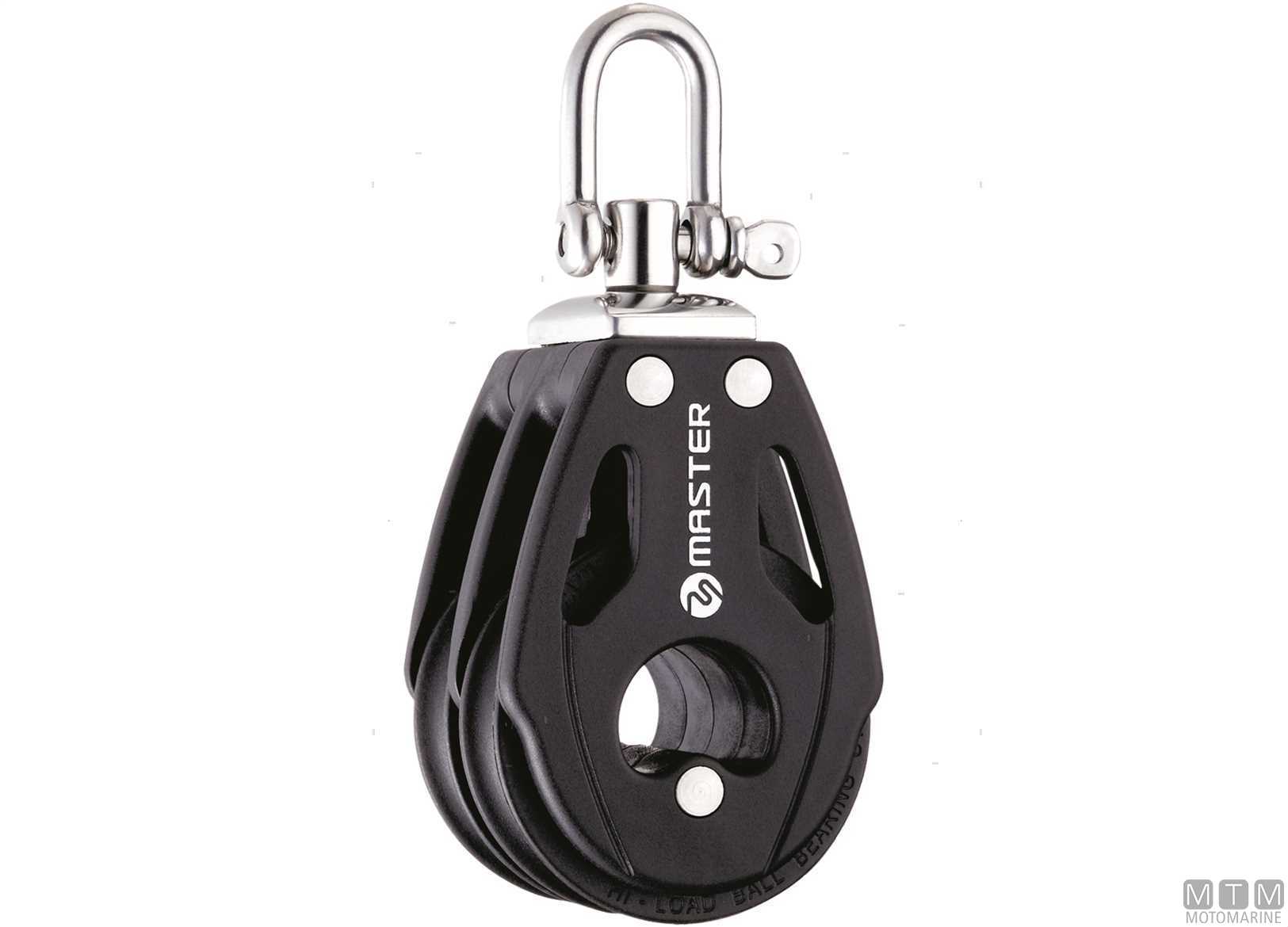 Bozzelli Master su sfere con puleggia da 75 mm. Cassa in materiale composito ultra leggero rinforzato con fibra e UV resistente. Il grillo girevole può essere bloccato in due posizioni grazie alla leva di blocco. Sfere ad alto scorrimento in Delrin stabilizzato UV. ↵NB. Il carico di lavoro/rottura dei bozzelli con strozza scotte sono relativi allo strozza scotte.