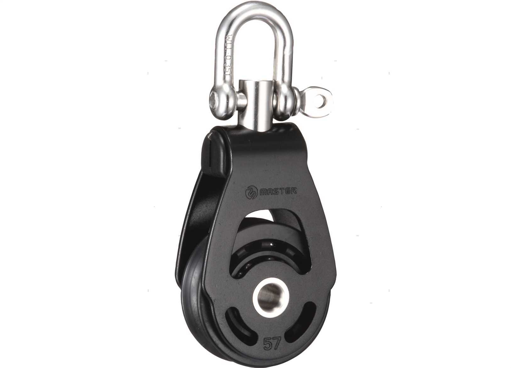Bozzelli Master su sfere con puleggia e cassa in Alluminio anodizzato nero. Il grillo girevole può essere bloccato in due posizioni grazie alla leva di blocco. ↵Sfere ad alto scorrimento in Delrin stabilizzato UV.