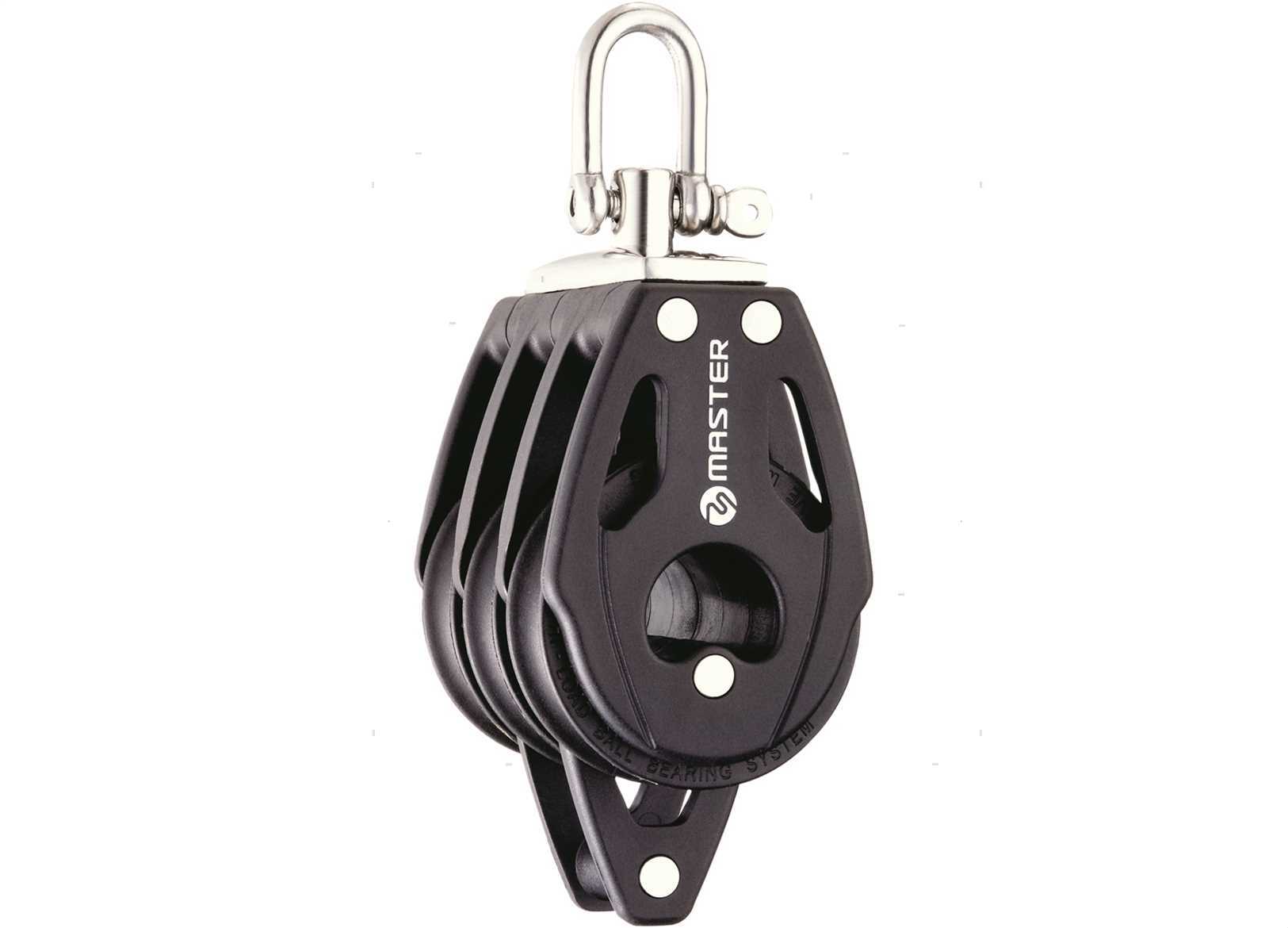 Bozzelli Master su sfere con puleggia da 75 mm. Cassa in materiale composito ultra leggero rinforzato con fibra e UV resistente. Il grillo girevole può essere bloccato in due posizioni grazie alla leva di blocco. Sfere ad alto scorrimento in Delrin stabilizzato UV. ↵NB. Il carico di lavoro/rottura dei bozzelli con strozza scotte sono relativi allo strozza scotte.