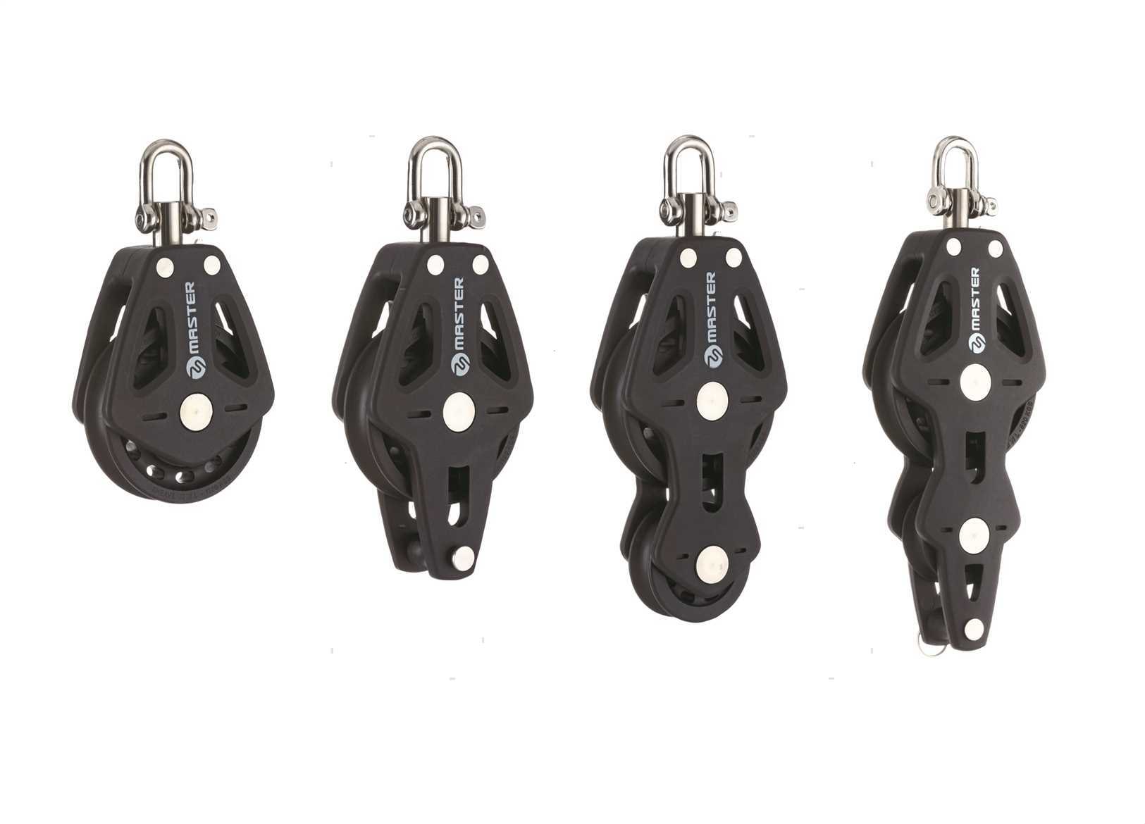 Bozzelli Master su boccola con grande capacità di carico e puleggia da 90 mm. Cassa in materiale composito ultra leggero rinforzato con fibra e UV resistente. Il grillo girevole può essere bloccato in due posizioni grazie alla leva di blocco.
