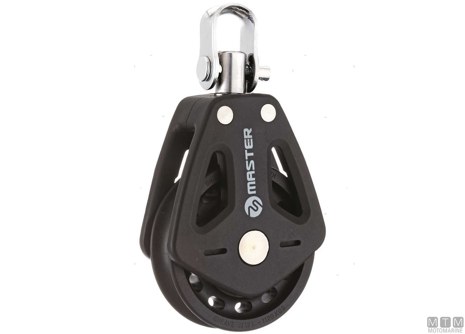 Bozzelli Master su boccola con grande capacità di carico e puleggia da 72 mm. Cassa in materiale composito ultra leggero rinforzato con fibra e UV resistente. Il grillo girevole può essere bloccato in due posizioni grazie alla leva di blocco. ↵ NB. Il carico di lavoro/rottura dei bozzelli con strozza scotte sono relativi allo strozza scotte.