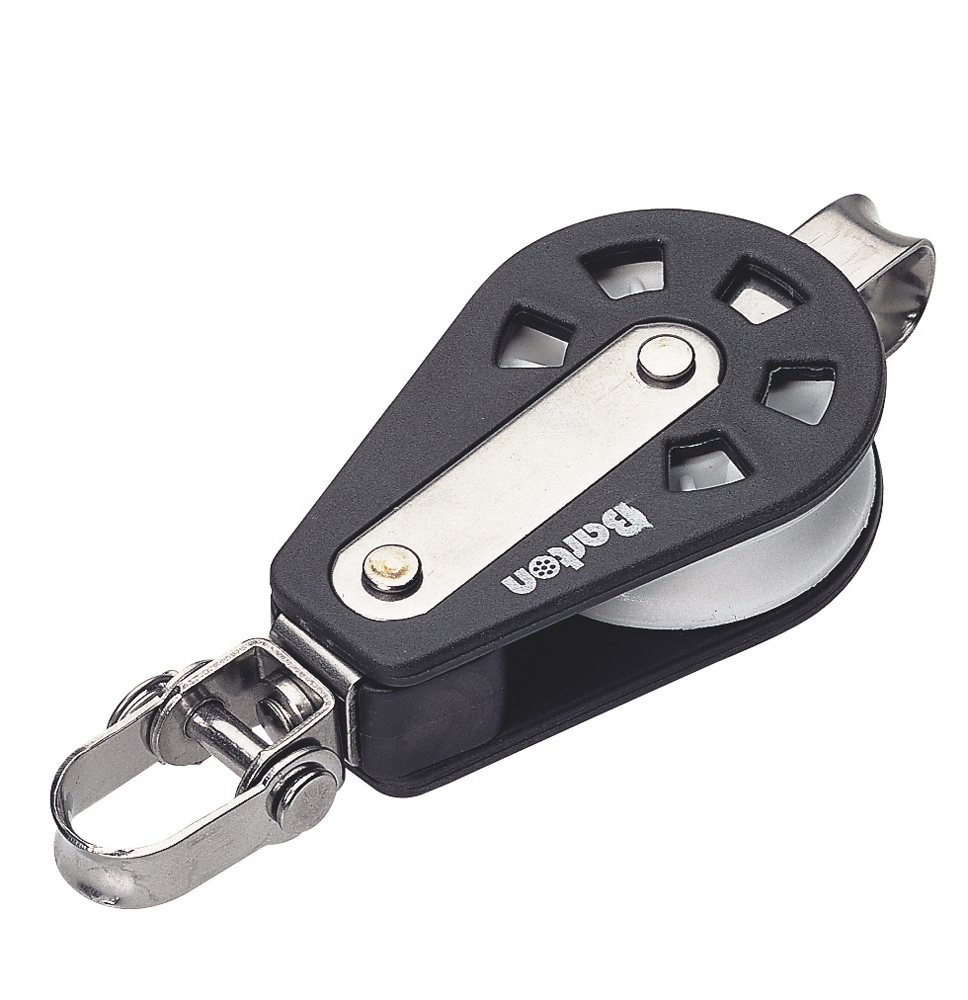 Bozzello singolo con occhio girevole e arricavo, Ø cima mm. 8, max carico di lavoro kg. 350 carico di rottura kg. 700, dimensioni puleggia mm.30 lunghezza mm.96