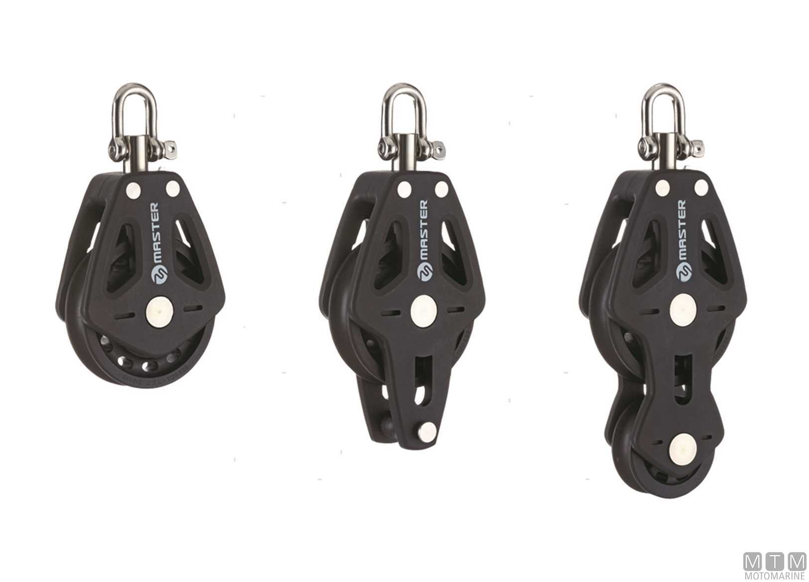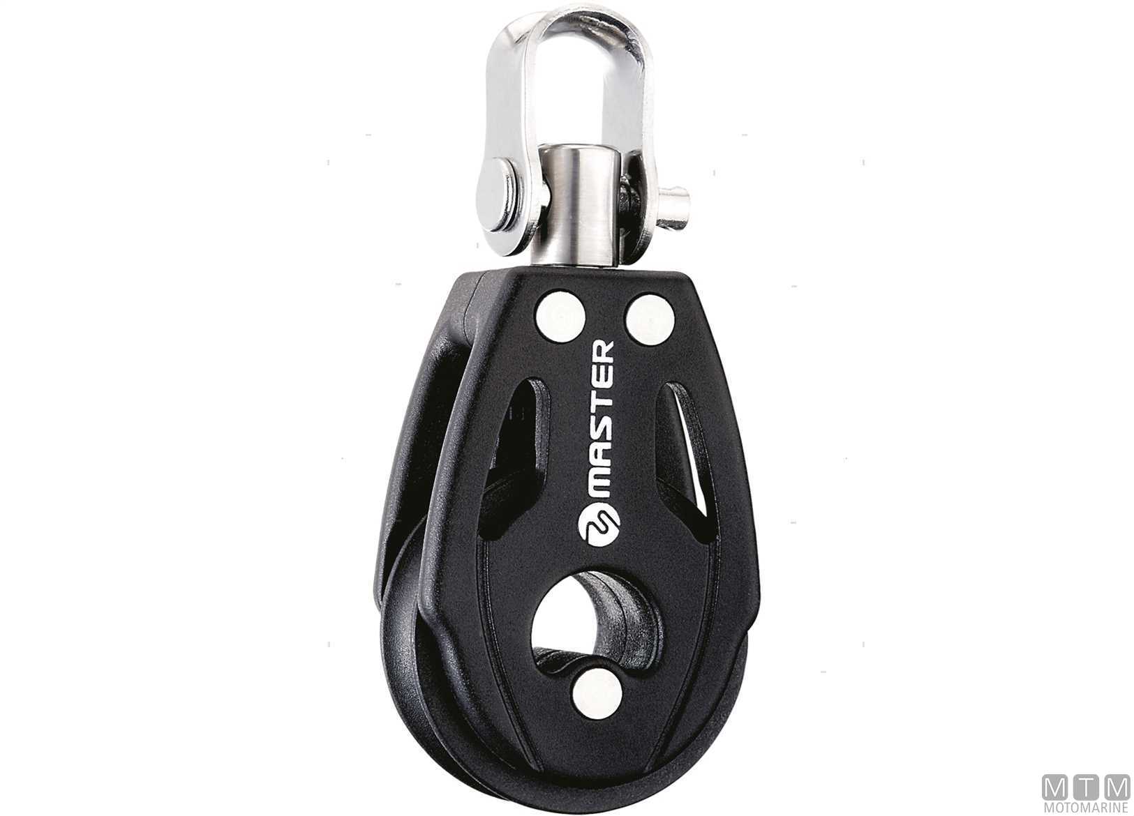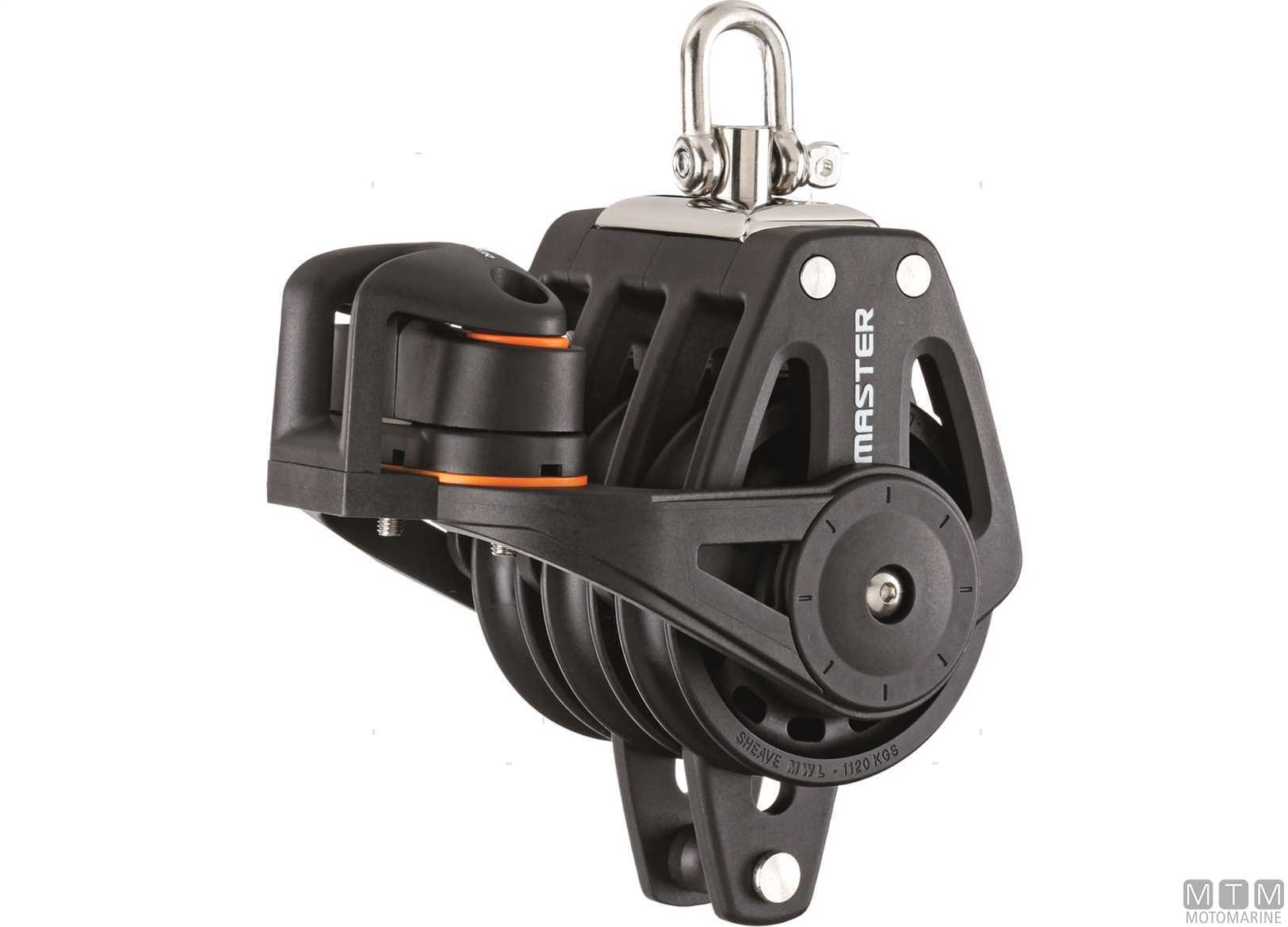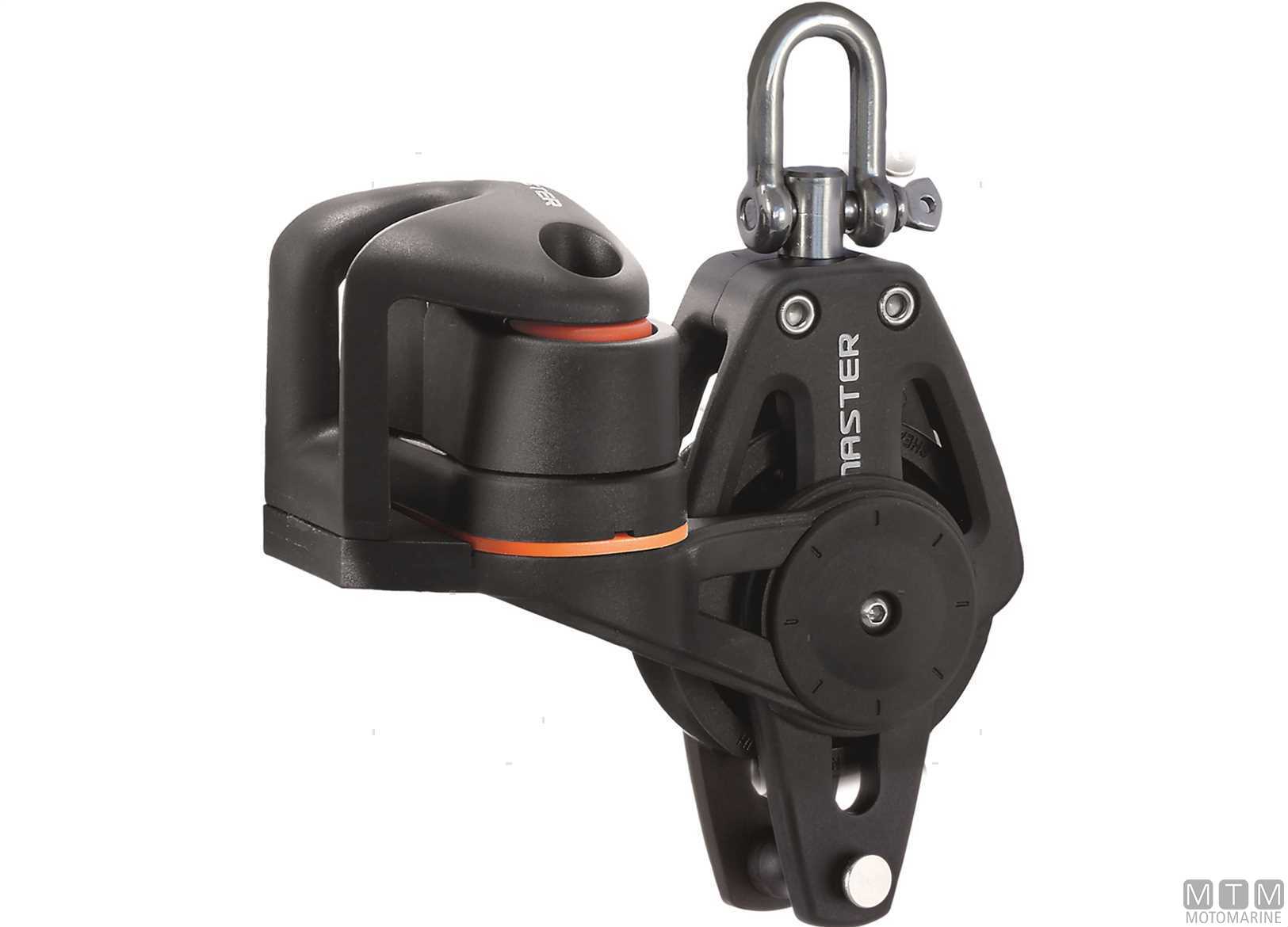 Bozzelli Master su boccola con grande capacità di carico e puleggia da 50 mm. Cassa in materiale composito ultra leggero rinforzato con fibra e UV resistente. Il grillo girevole può essere bloccato in due posizioni grazie alla leva di blocco. ↵ NB. Il carico di lavoro/rottura dei bozzelli con strozza scotte sono relativi allo strozza scotte.