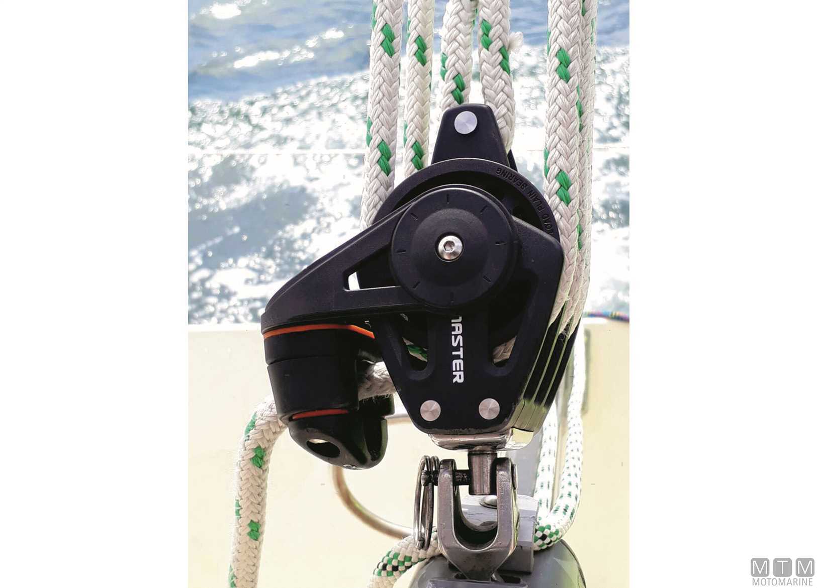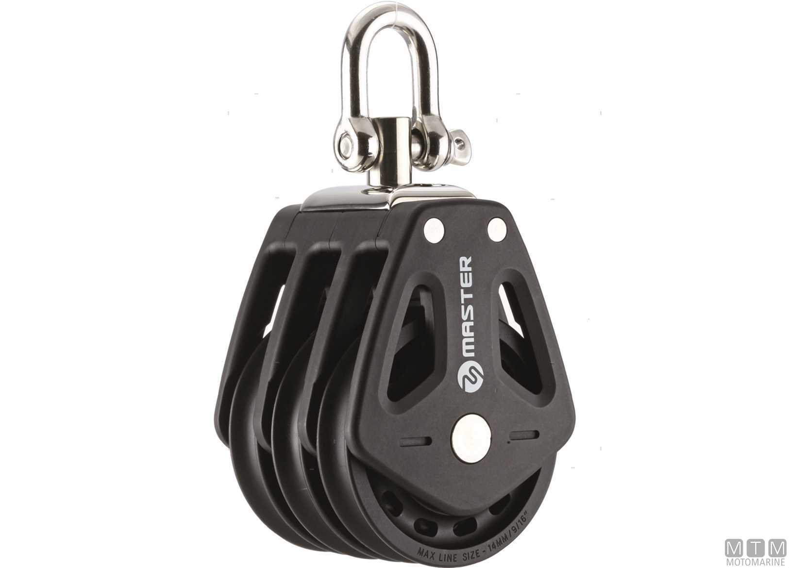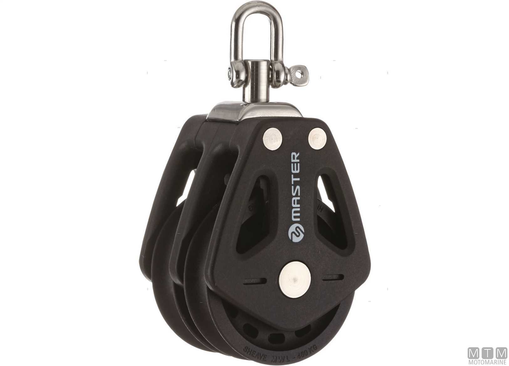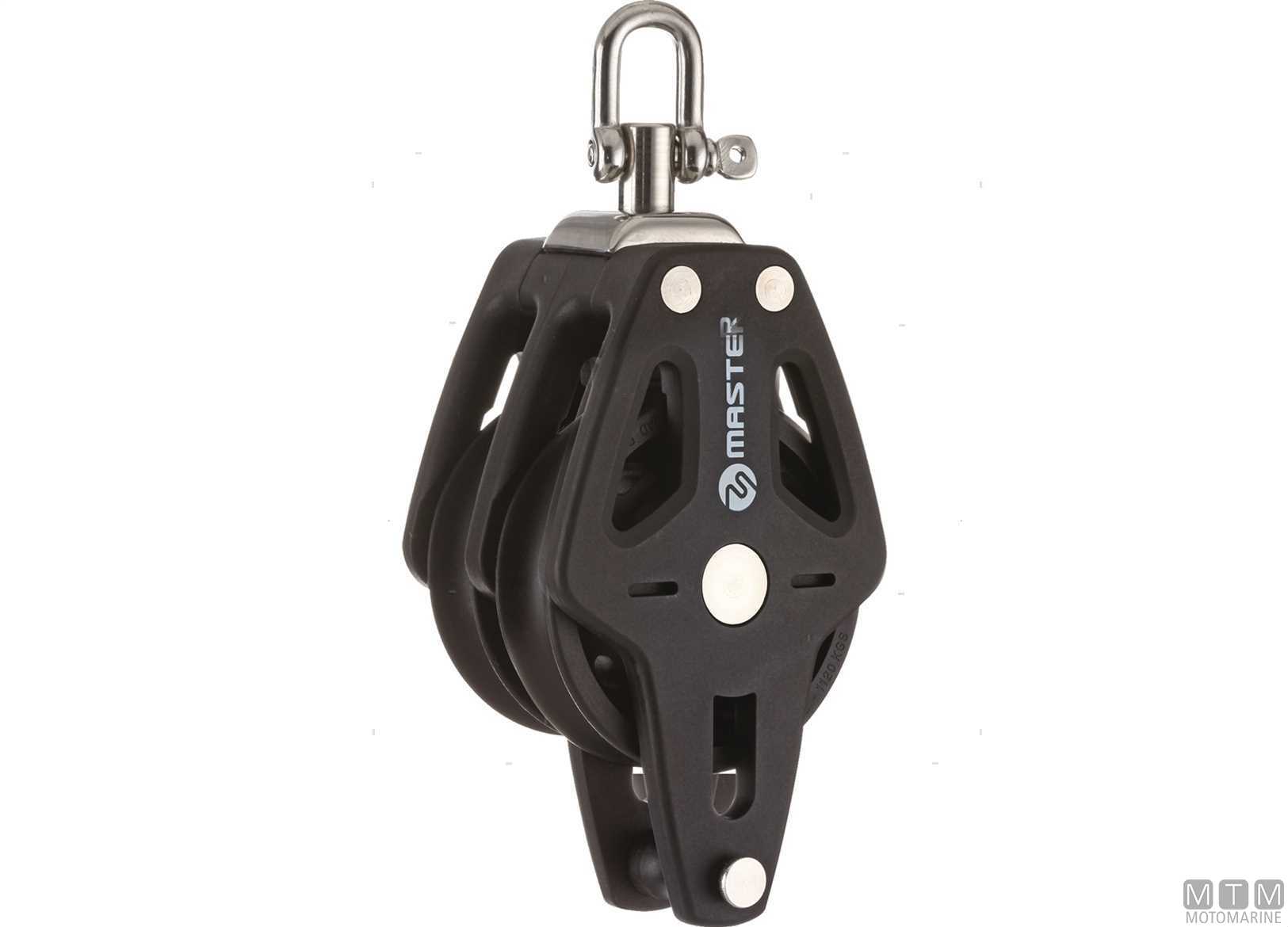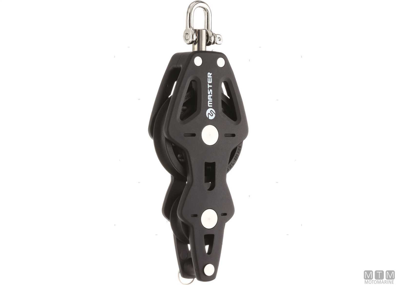 Bozzelli Master su boccola con grande capacità di carico e puleggia da 50 mm. Cassa in materiale composito ultra leggero rinforzato con fibra e UV resistente. Il grillo girevole può essere bloccato in due posizioni grazie alla leva di blocco. ↵ NB. Il carico di lavoro/rottura dei bozzelli con strozza scotte sono relativi allo strozza scotte.
