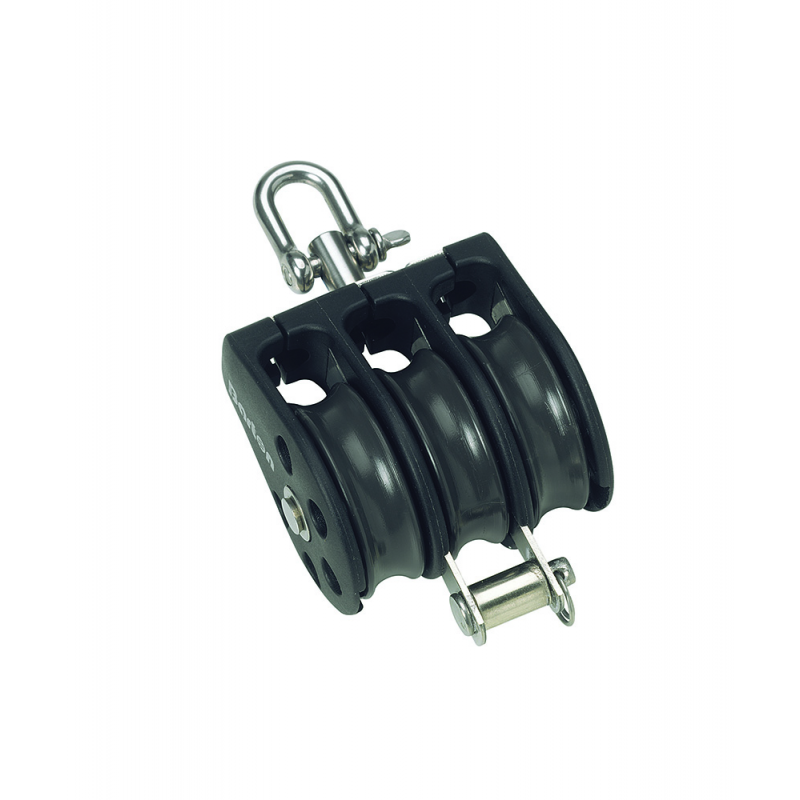 Bozzello triplo con occhio girevole e arricavo, Ø cima mm. 12, max carico di lavoro kg. 630 carico di rottura kg. 1260, dimensioni puleggia mm.58 lunghezza mm.155
