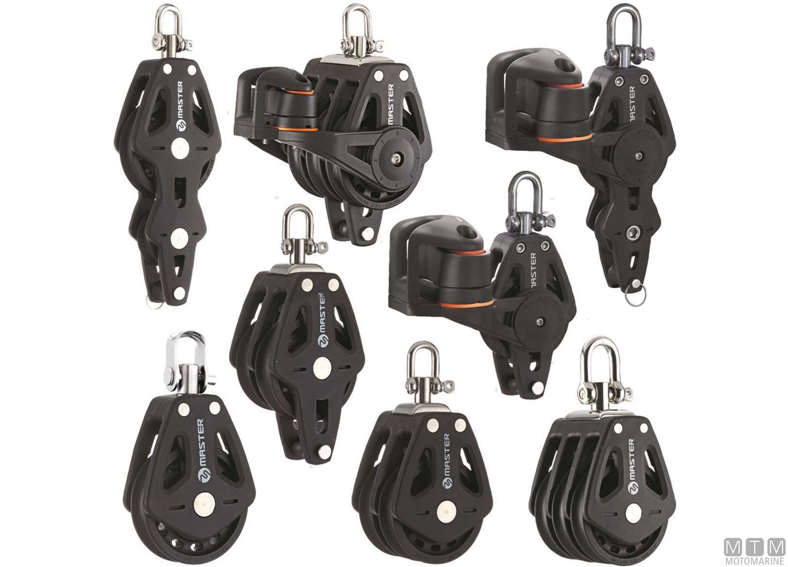 Bozzelli Master su boccola con grande capacità di carico e puleggia da 50 mm. Cassa in materiale composito ultra leggero rinforzato con fibra e UV resistente. Il grillo girevole può essere bloccato in due posizioni grazie alla leva di blocco. ↵ NB. Il carico di lavoro/rottura dei bozzelli con strozza scotte sono relativi allo strozza scotte.