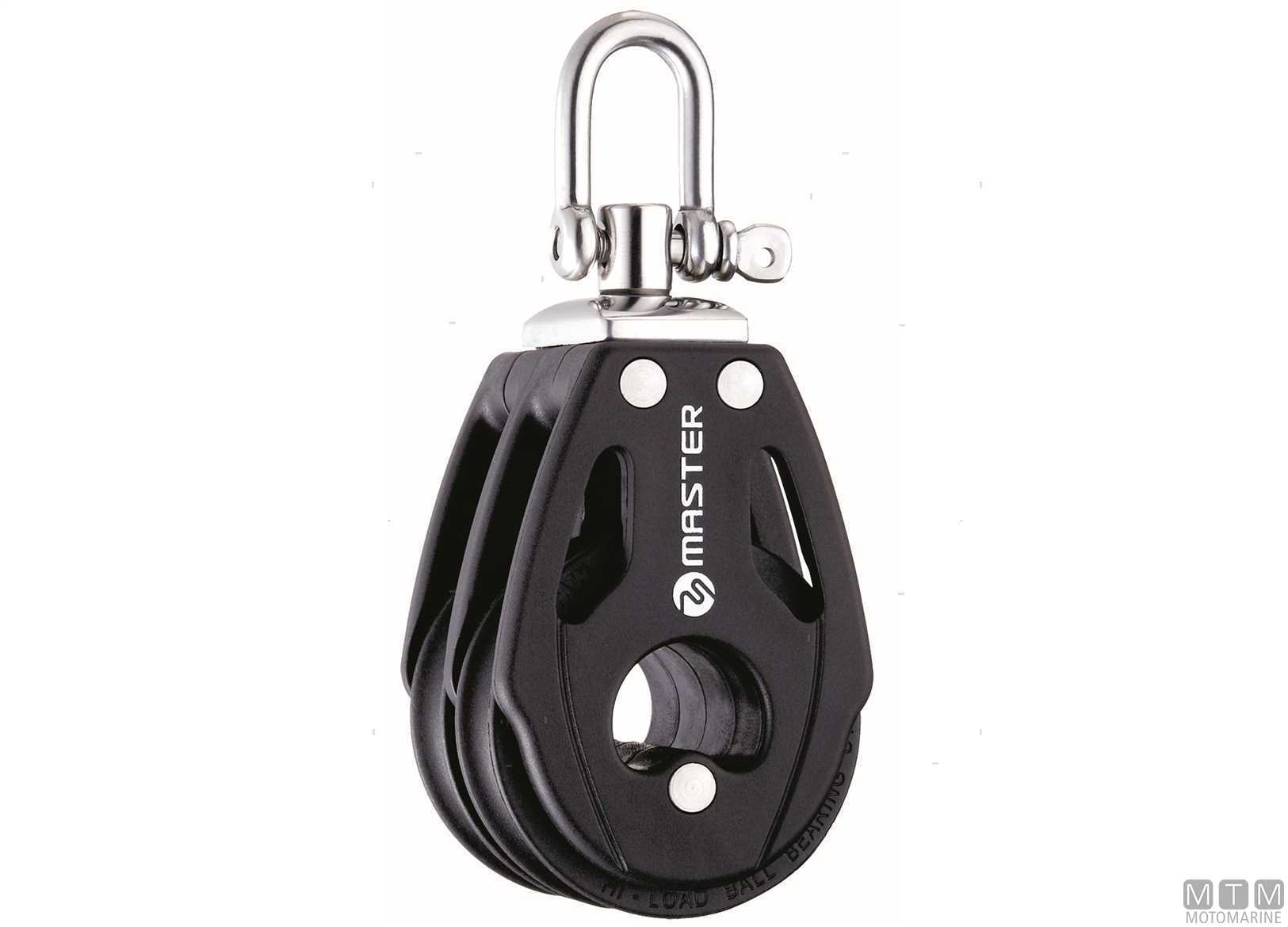 Bozzelli Master su sfere con puleggia da 57 mm. Cassa in materiale composito ultra leggero rinforzato con fibra e UV resistente. Il grillo girevole può essere bloccato in due posizioni grazie alla leva di blocco. Sfere ad alto scorrimento in Delrin stabilizzato UV. ↵NB. Il carico di lavoro/rottura dei bozzelli con strozza scotte sono relativi allo strozza scotte.