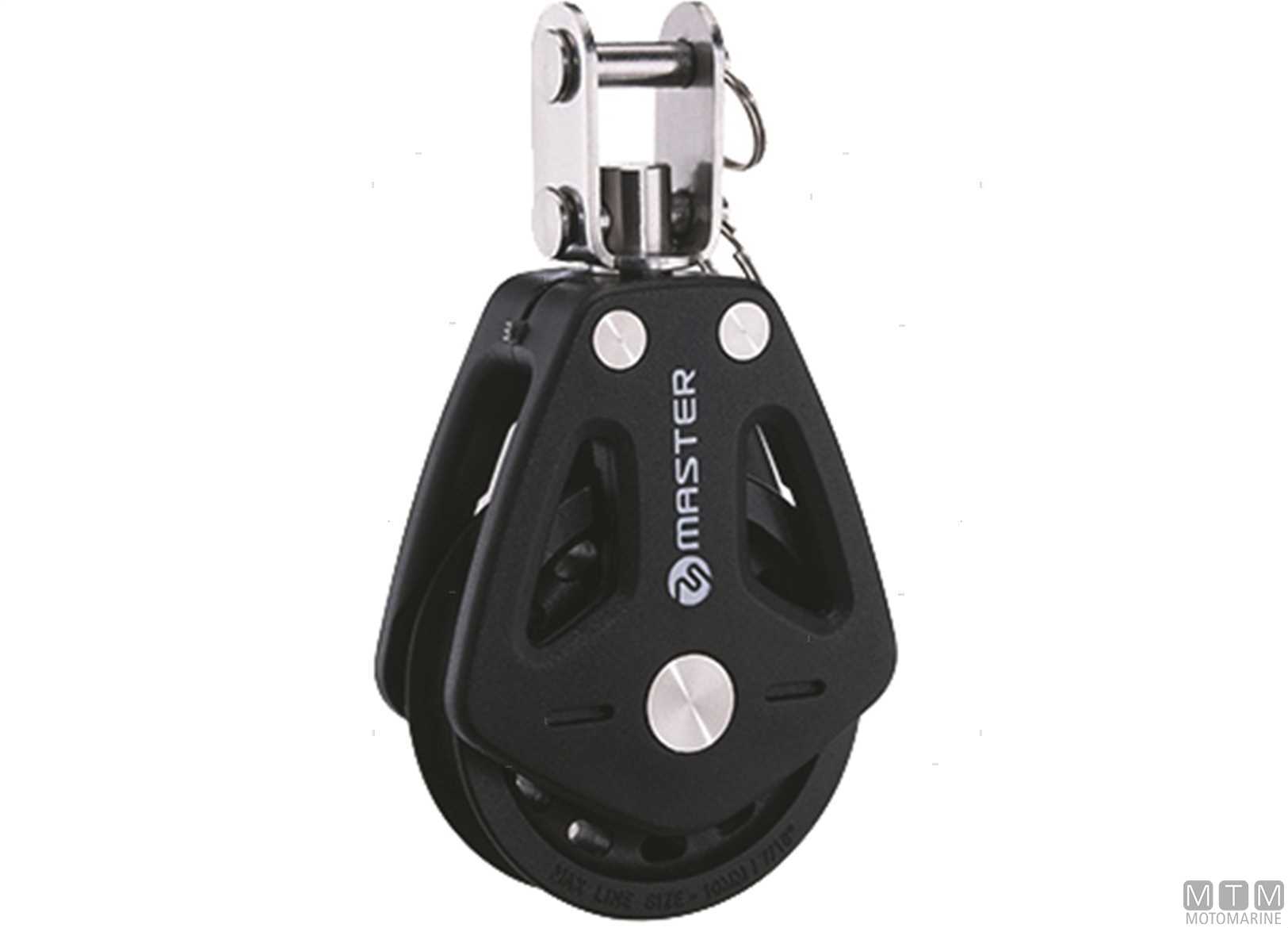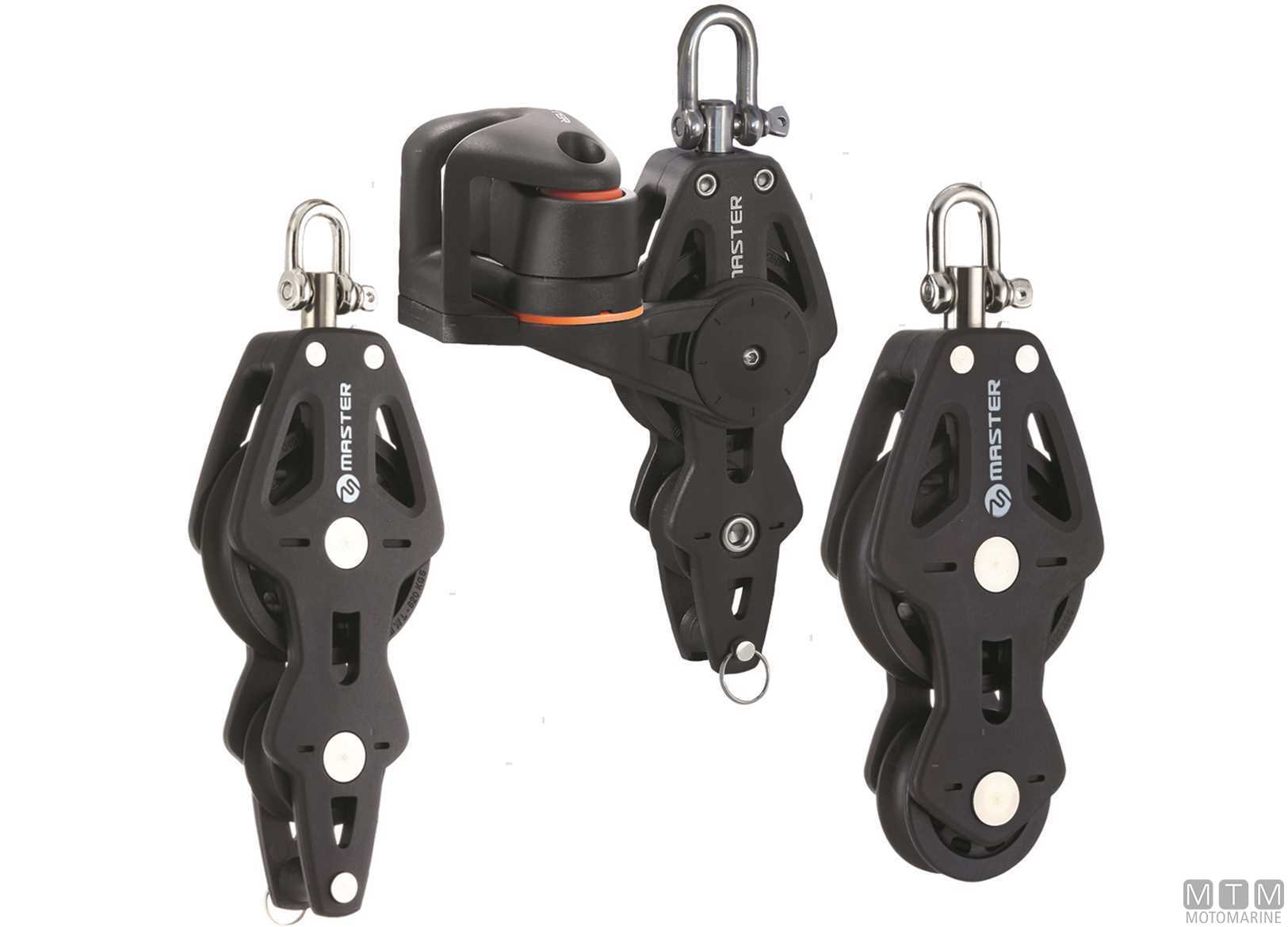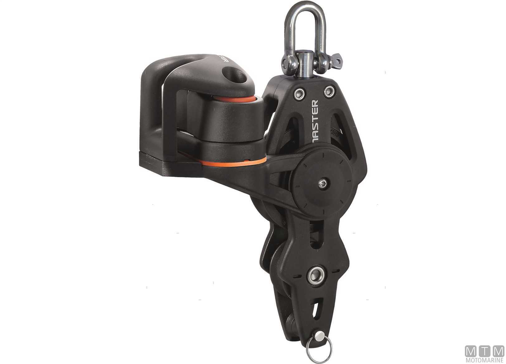 Bozzelli Master su boccola con grande capacità di carico e puleggia da 60 mm. Cassa in materiale composito ultra leggero rinforzato con fibra e UV resistente. Il grillo girevole può essere bloccato in due posizioni grazie alla leva di blocco. ↵ NB. Il carico di lavoro/rottura dei bozzelli con strozza scotte sono relativi allo strozza scotte.