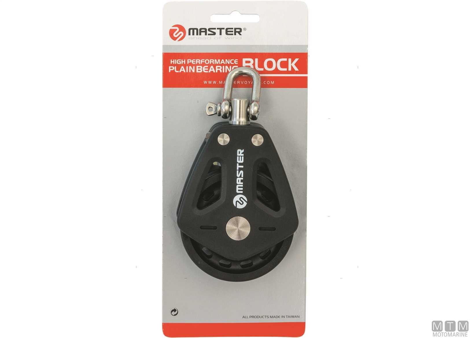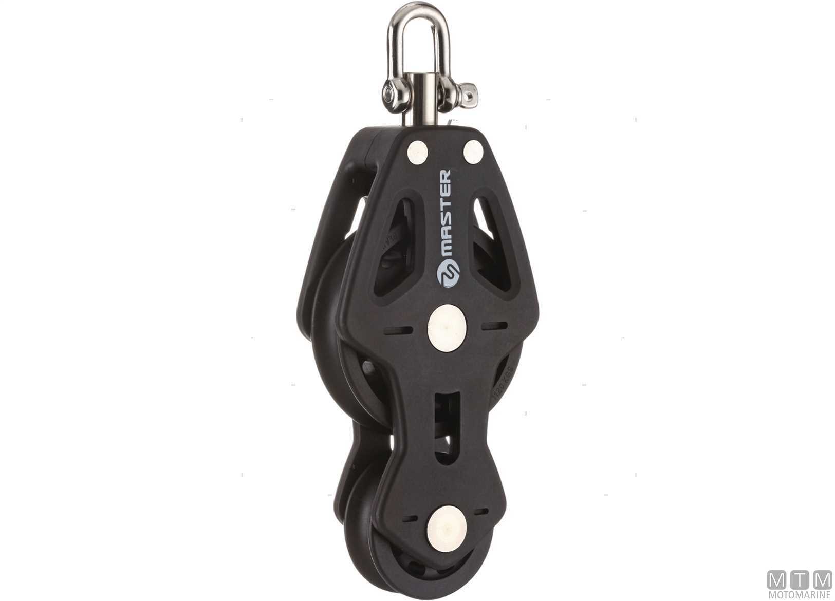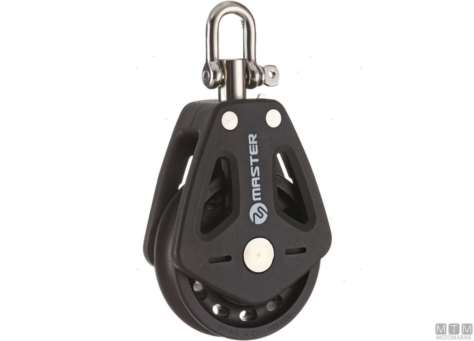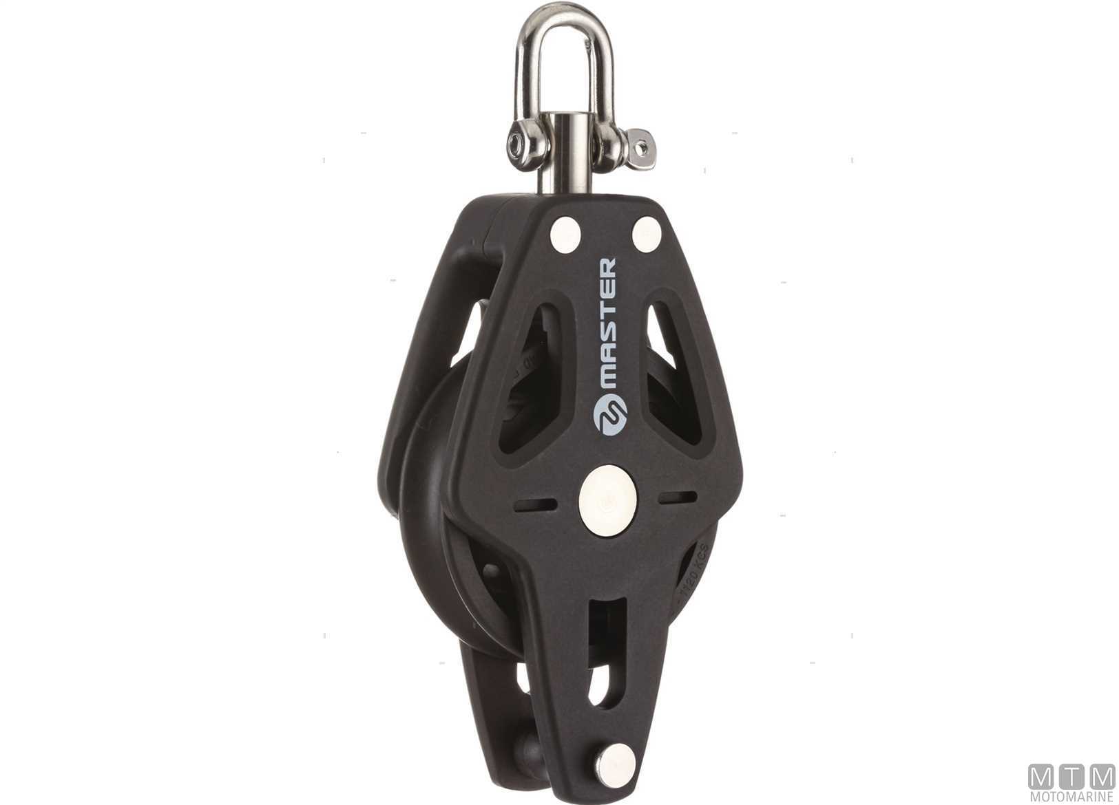 Bozzelli Master su boccola con grande capacità di carico e puleggia da 60 mm. Cassa in materiale composito ultra leggero rinforzato con fibra e UV resistente. Il grillo girevole può essere bloccato in due posizioni grazie alla leva di blocco. ↵ NB. Il carico di lavoro/rottura dei bozzelli con strozza scotte sono relativi allo strozza scotte.