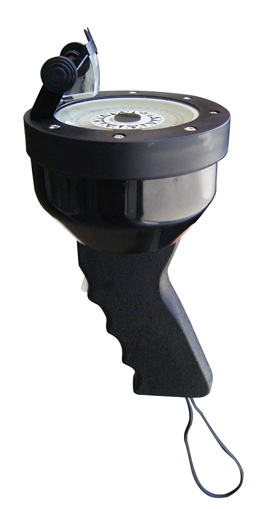 Bussola da rilevamento con lettura mediante prisma. Ø apparentemm. 57,5, sospensione a spillo. Rosa bianca con gradazione neradi 1°, illuminazione con batteria da 1,5 V di serie
