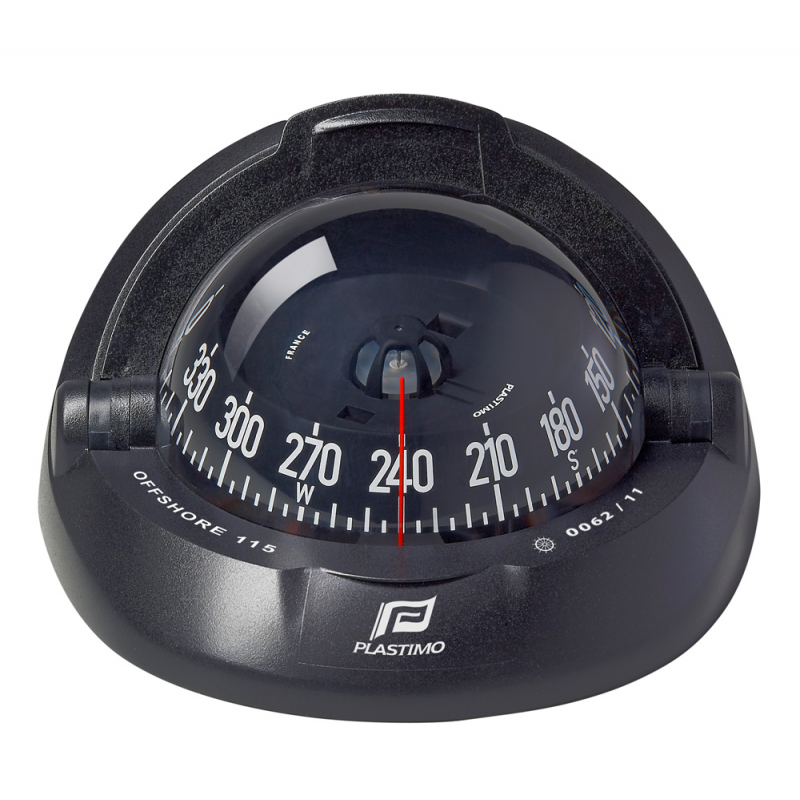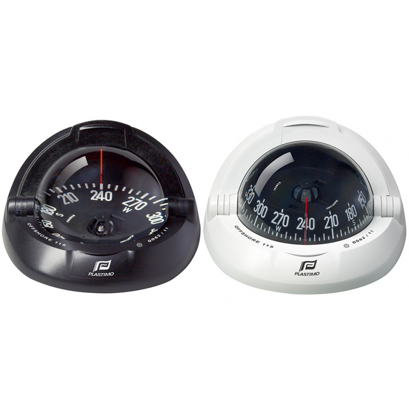 Bussola Offshore 115 conforme SOLAS MED 96/98 per barche da 8 a 12 metri, rosa conica nera con gradazione 5°. Montaggio ad incasso su piano orizzontale con calotta di protezione telescopica in tre parti scorrevoli. Dimensioni mm. 159 x 159