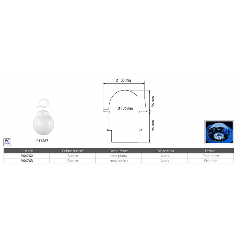 Ø apparente mm. 81. Rosa con graduazione ogni 5°, per barche a vela da mt 8 a 12, illuminazione di serie 12-24 V LED.Installazione ad incasso su piano orizzontale.