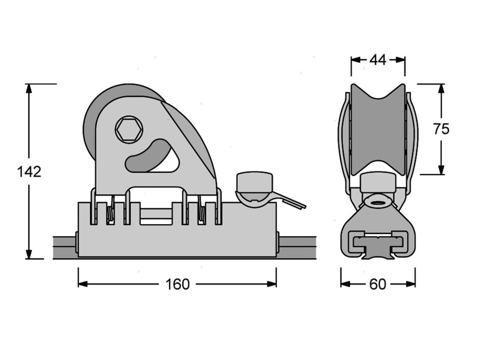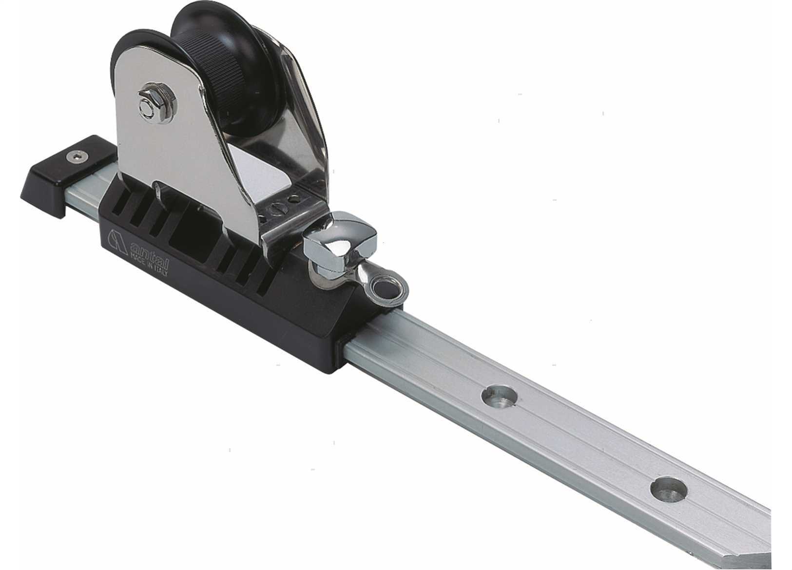 Carrello in Alluminio ossidato Nero su pattini in Nylon a basso attrito. Supporto puleggia in Acciaio AISI 316 orientabile (± 50°). Puleggia in Alluminio con doppio cuscinetto laterale a sfere. Fermo d’arresto in Acciaio AISI 316 con posizione di disinserimento. Arricavo frontale.↵Carico di lavoro (SWL) 3800 Kg. ↵↵Rotaia a T passo foratura 100 mm. ↵Profilo in Alluminio ad alta resistenza anodizzato. ↵Fissaggio con viti da 8 mm.