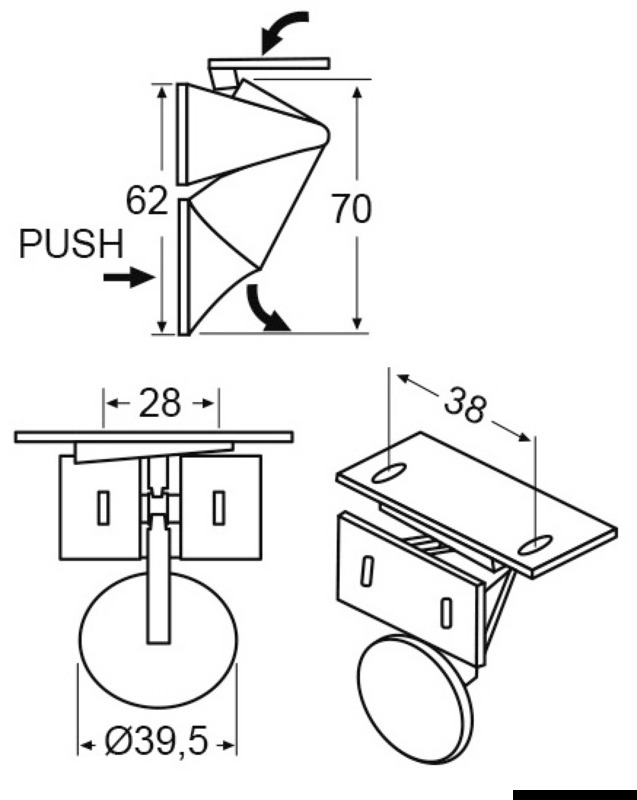 Si monta all’interno dell’antina lasciando un foro che viene chiuso dalla parte lucidata a specchio; per aprire l’antina si esercita una pressione sul foro che funge anche da maniglia. Contropiastra con dente inclinato per maggior facilità di installazione.