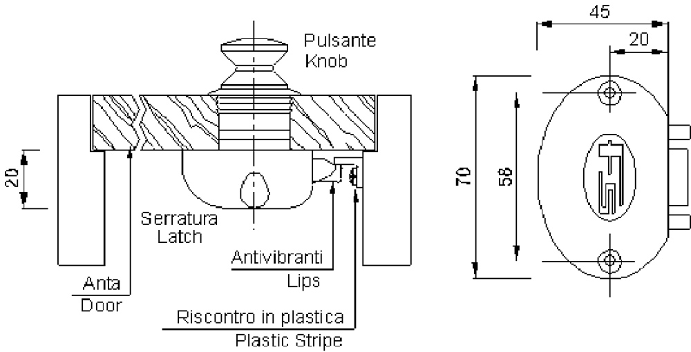 Serratura in plastica con riscontro, dim. mm 70 x 45