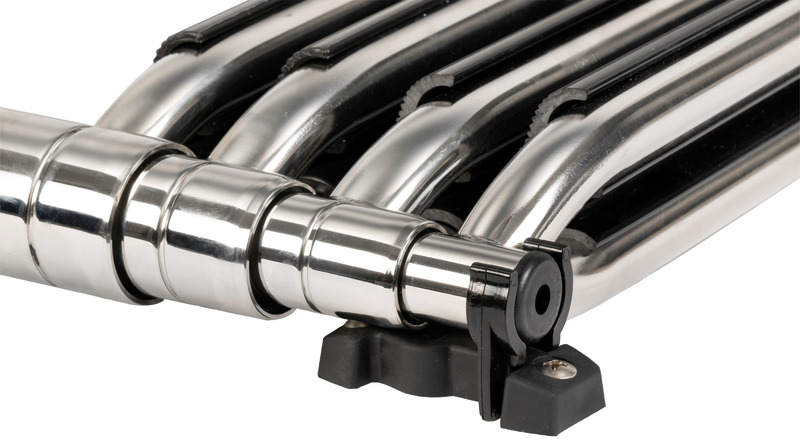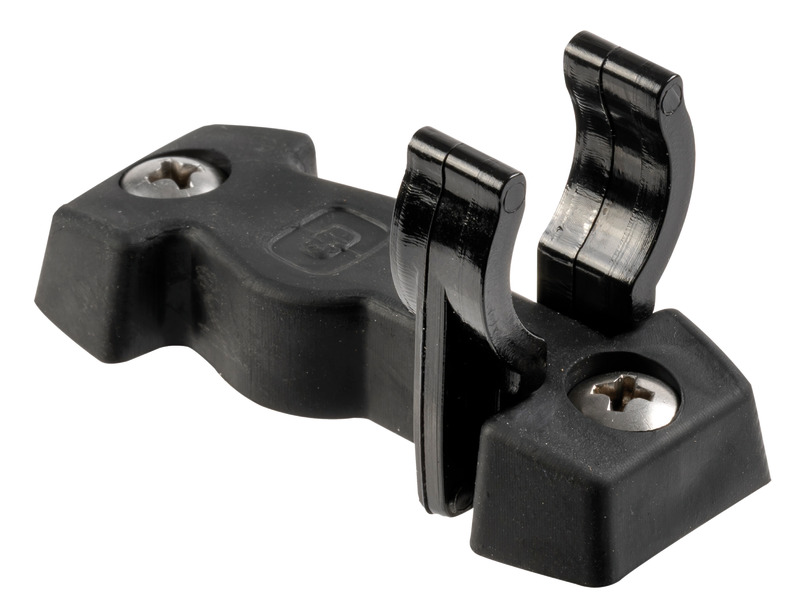 La clip in nylon si aggancia al tubolare della scaletta permettendo una posizione di sicurezza in navigazione, mentre quando non è in uso viene ripiegata sulla coperta integrandosi nella sua base di montaggio in EPDM antiurto.