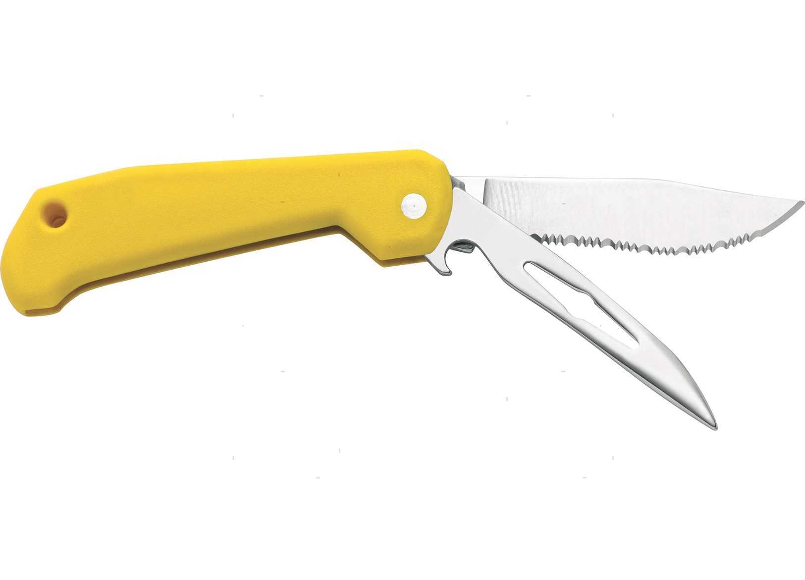 Coltello a serramanico con gira-grilli, apribottiglia e cavigliera aprinodi. Manico in PP, lama in Acciaio Inossidabile W1.4028.